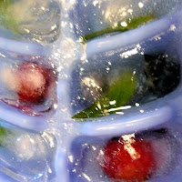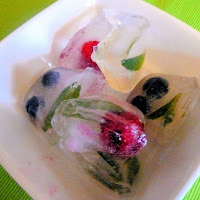 I also decided to make fun ice cubes to go along with this. Normal ice cubes are just fine, but this was an easy way to make the drink a little more snazzy. Place some mint leaves and some of the smaller berries (raspberries, blueberries) into an ice cube tray. Mix and match to your taste. I did a little of everything– mint by itself, mint and raspberries, and mint and blueberries. Fill gently with water and freeze. The leaves and berries might float to the top of the ice cube, but who cares! They still look great.