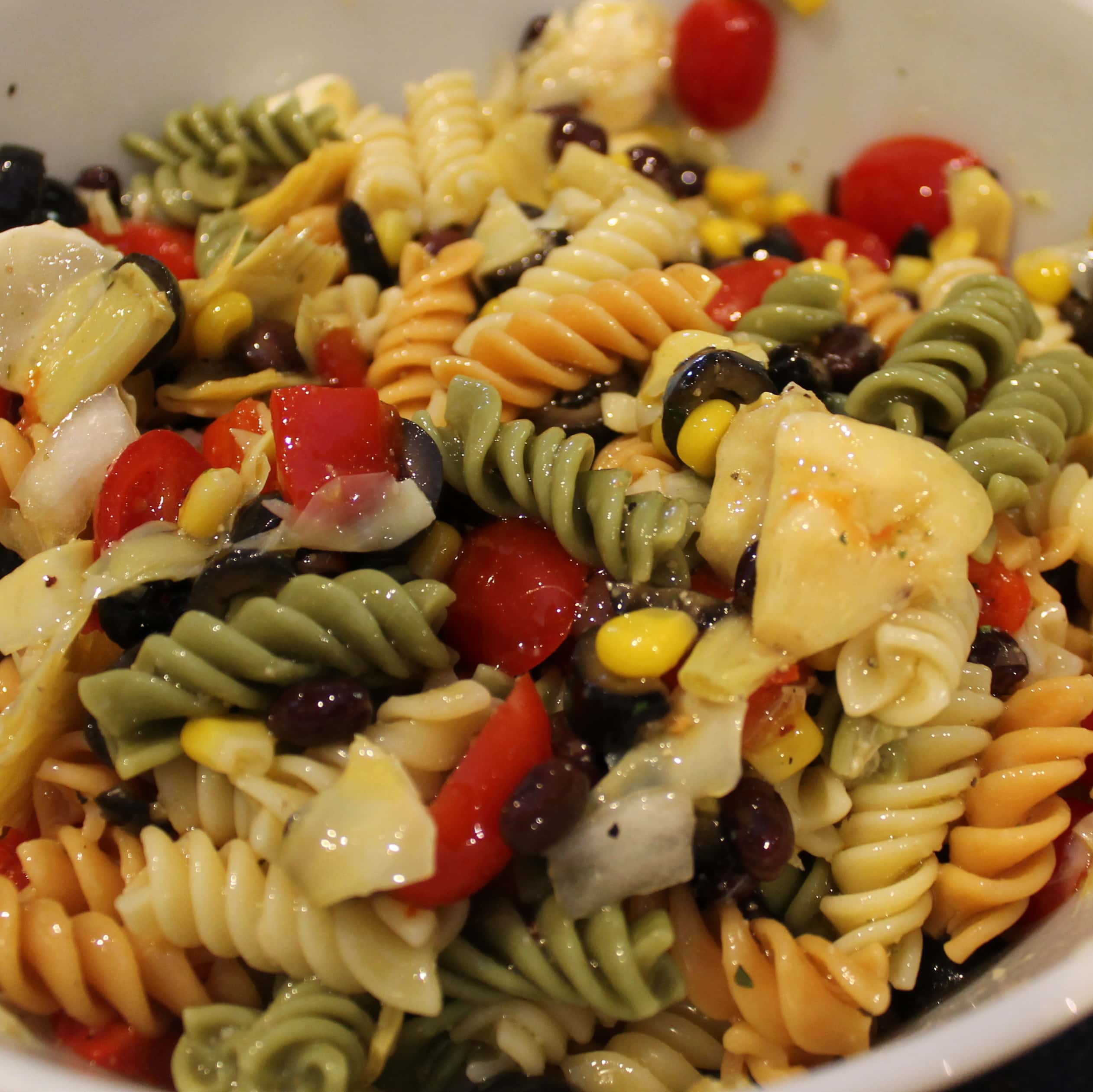 While the pasta is cooking, prepare the rest of your ingredients. Slice your black olives, halve the mozzarella cheese and cherry tomatoes, chop the onion, artichoke hearts and roasted red peppers, rinse the black beans, and measure out the corn. Add to a large bowl. When the pasta is cooled, add and mix.