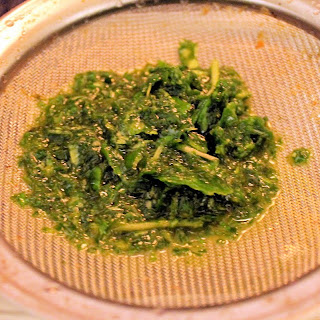 Using a fine mesh sieve, strain the basil mixture through the sieve, allowing the olive oil to drip into a small bowl. Press down on the basil leaves remaining in the sieve to release all the juices.