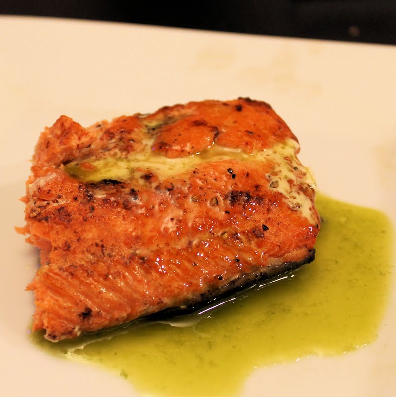 Remove from heat. Drizzle the basil oil over the salmon and serve.