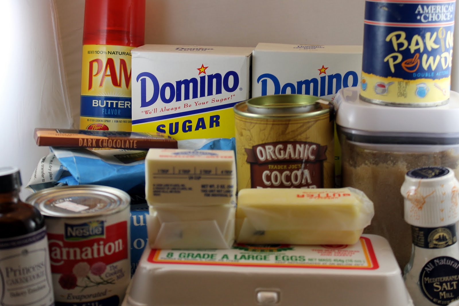 - Combine flour, granulated sugar, cocoa, brown sugar (I used light brown sugar), and baking powder in a large bowl.
