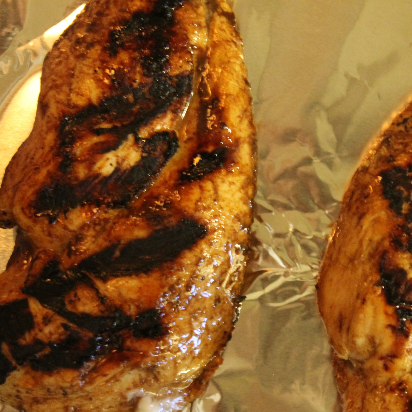 Add 1/4 cup balsamic vinegar, 1/2 tablespoon olive oil, 1 clove minced garlic, and salt and pepper to a ziplock bag. Add the chicken and shake to mix. Refrigerate until ready to use.