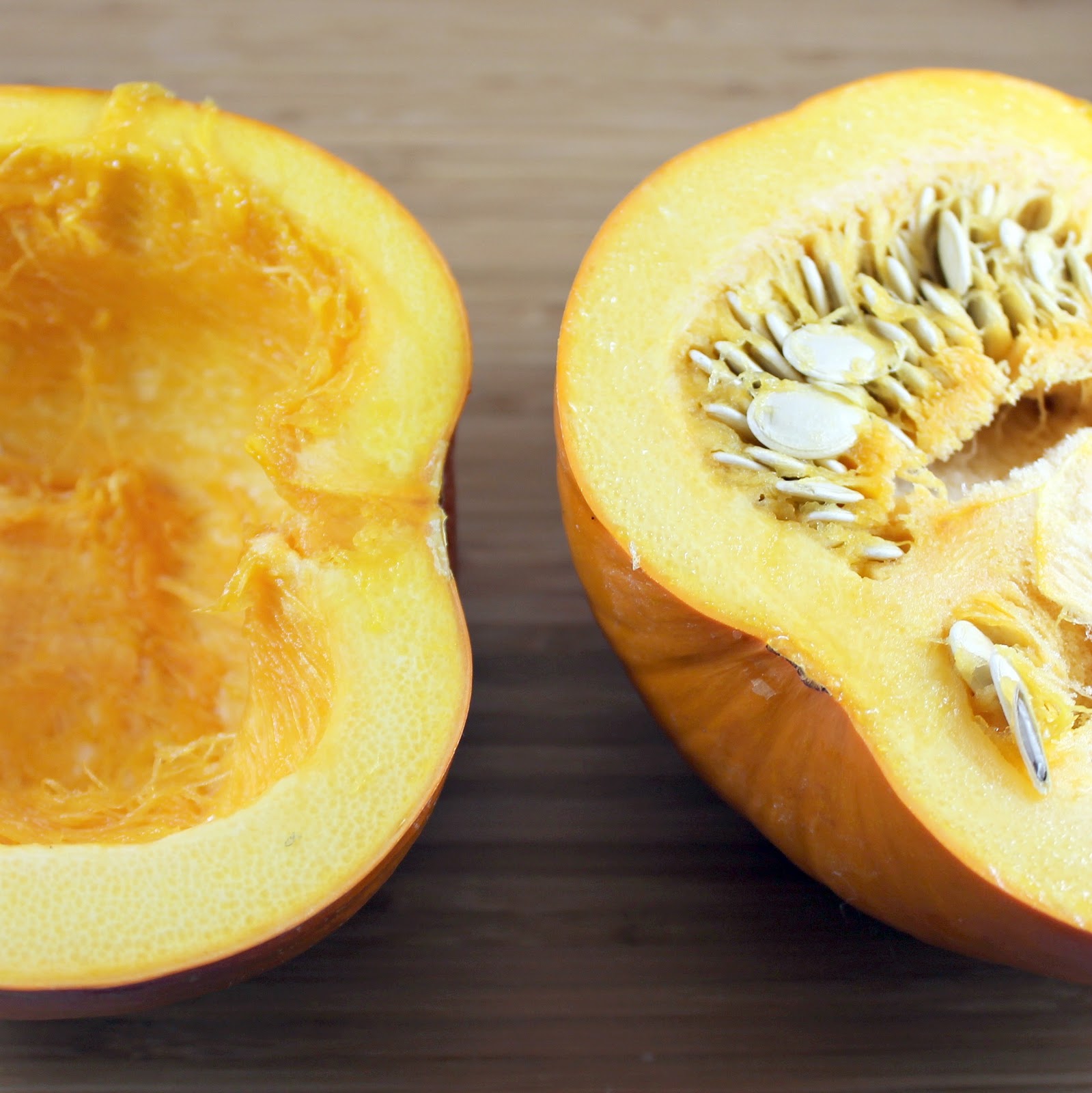 Slice the pumpkin in half and scoop out the insides and all the seeds.
