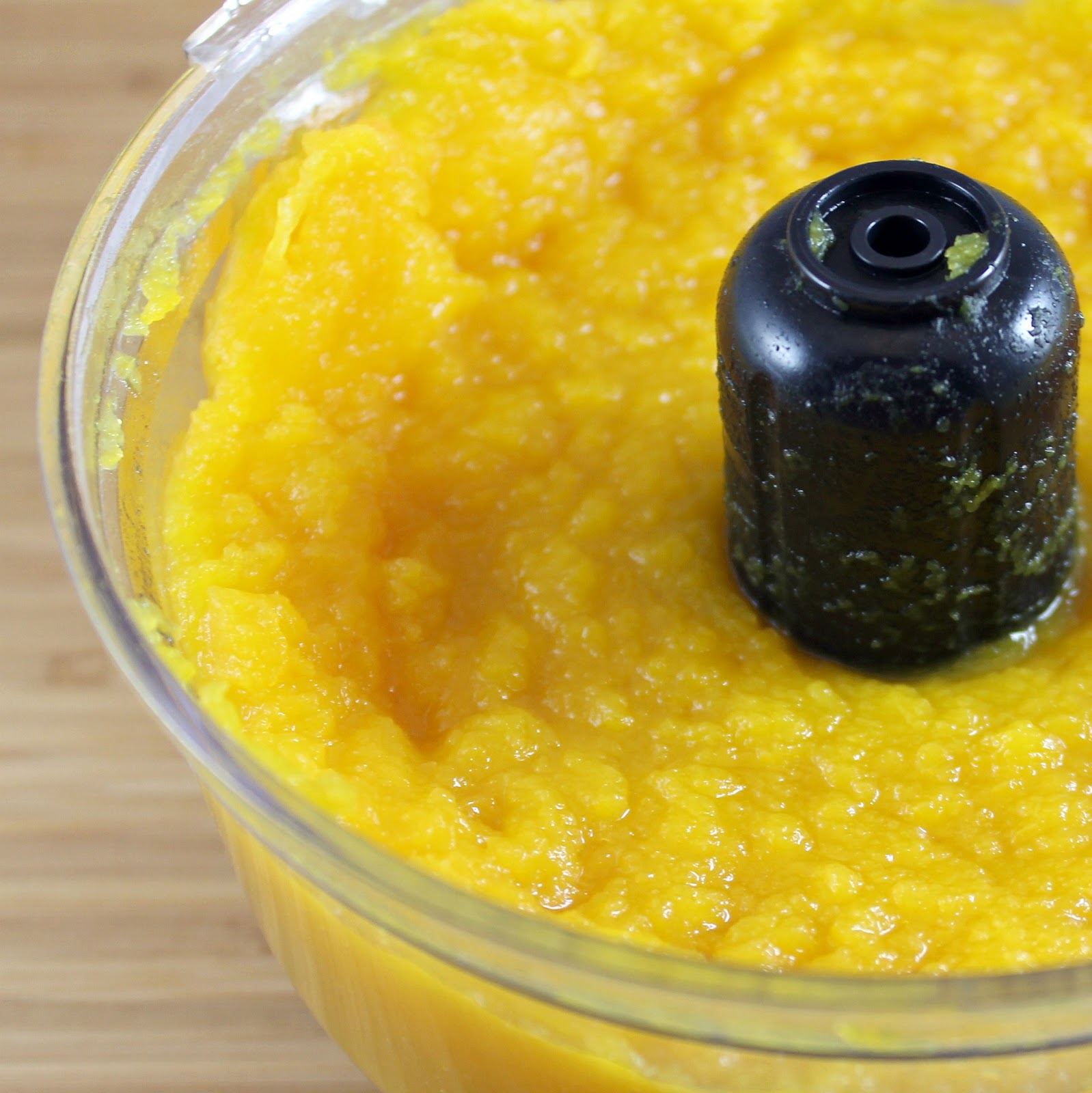 Allow the pumpkins to cool down until they are cool enough to touch. Scoop the flesh out of the pumpkins into a food processor and blend until smooth.