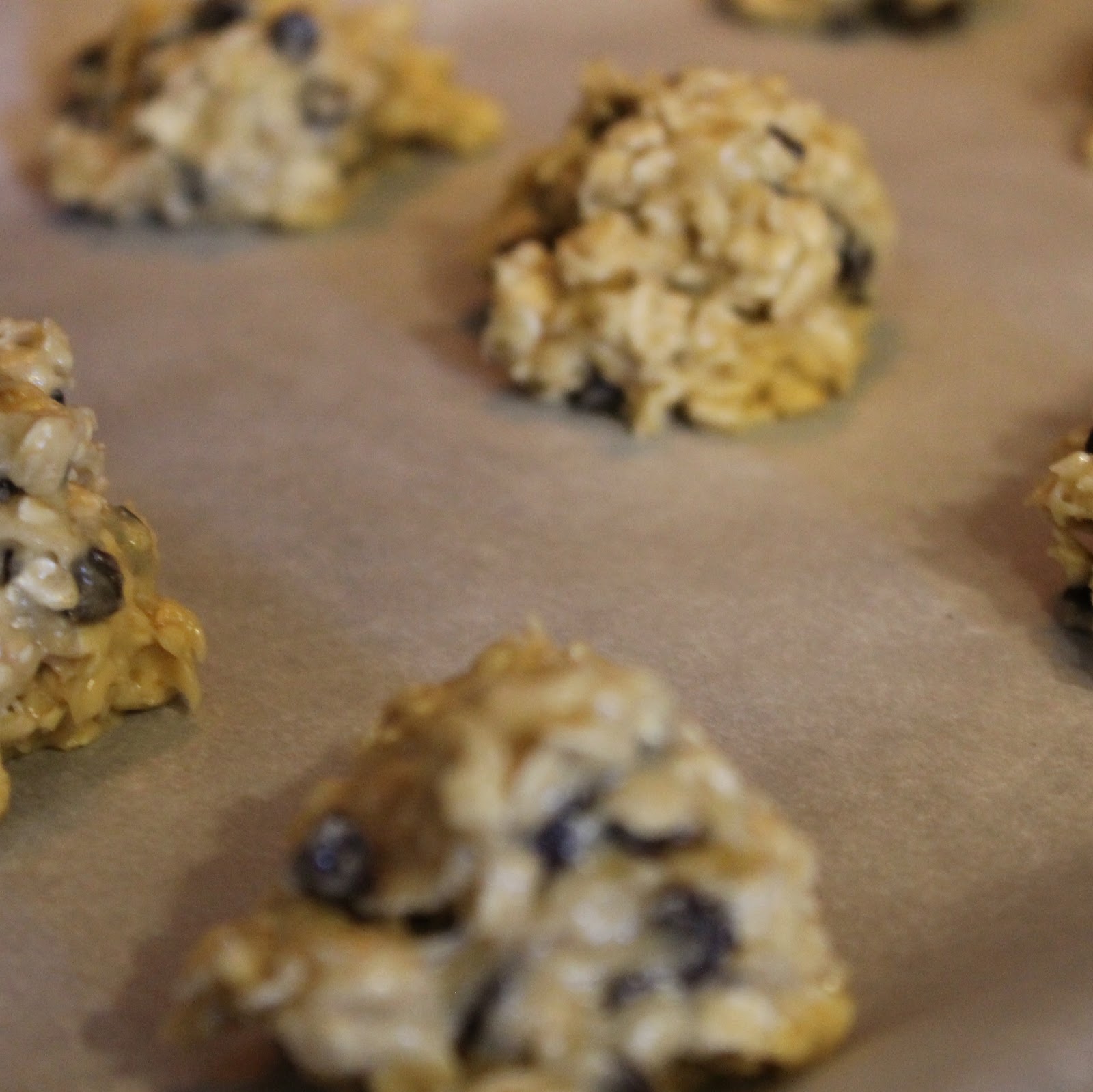 Drop large tablespoons onto a baking sheet lined with parchment paper. If you do not have parchment paper, coat a baking sheet with cooking spray before adding cookie dough. (It should make about 18 cookies)