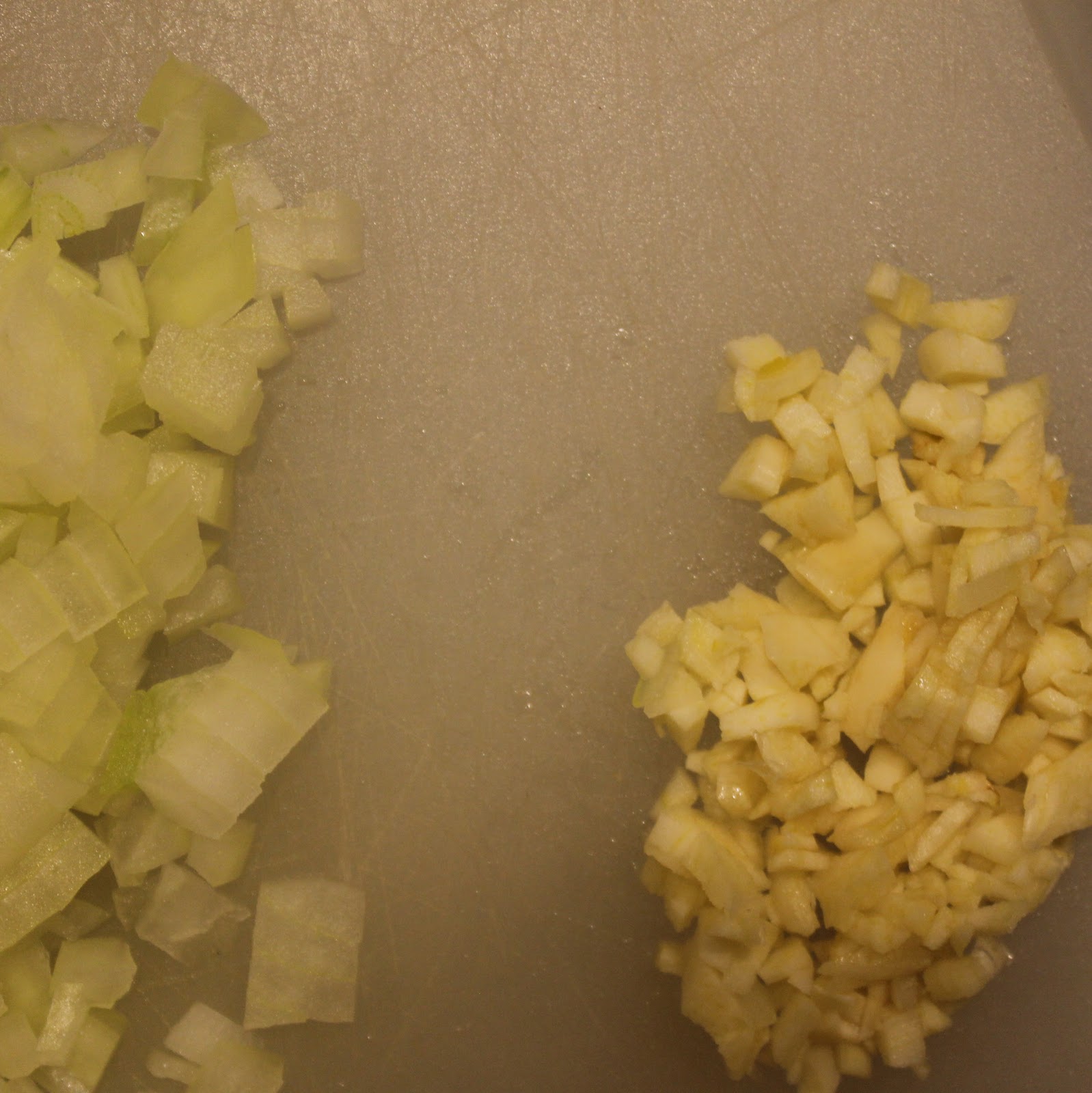 1. To prepare the barbecue sauce, chop the onions and garlic.