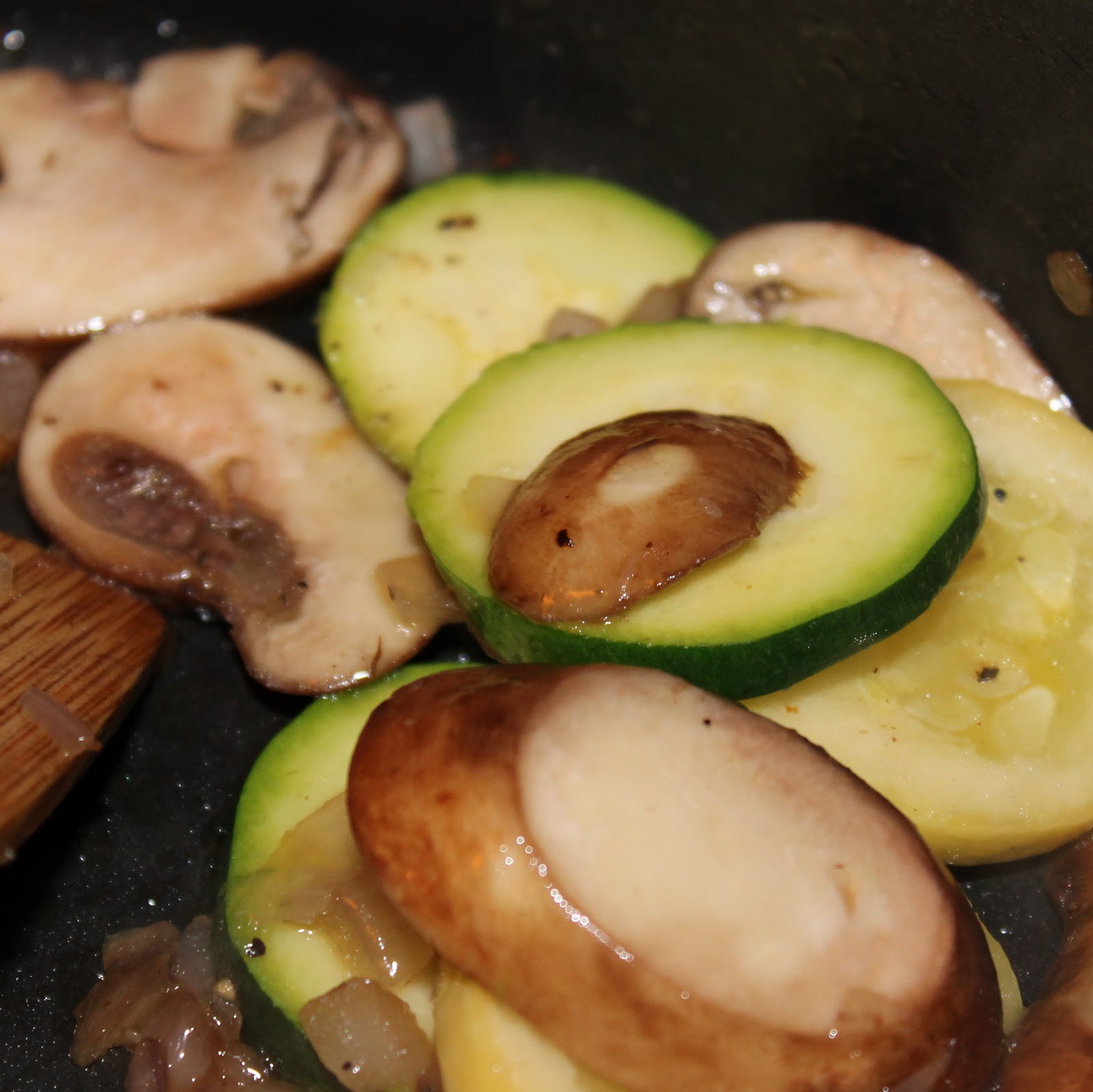 Add 1 tablespoon olive oil to a saute pan over medium high heat. Add the zucchini, onion, squash and mushrooms. Cook for 2 to 3 minutes, stirring occasionally. Add salt and pepper to taste and cook for another 3 minutes or until the vegetables are softened and are cooked through.