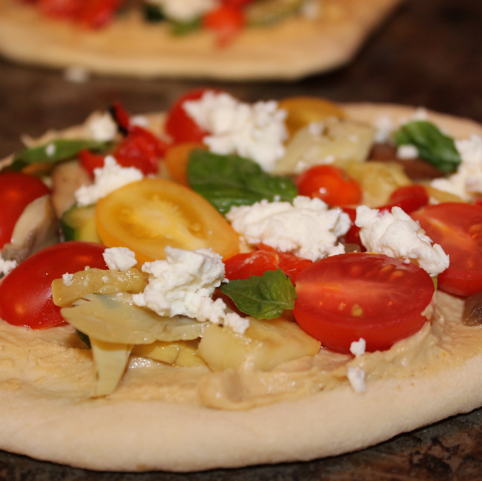 I love how colorful this pizza is! And you can never go wrong with hummus and goat cheese!