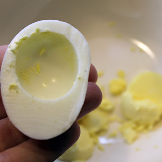 Scoop out the yolks and transfer them to a bowl. I used a half teaspoon so that the spoon was smaller than the yolks. They are pretty easy to kind of pop out.