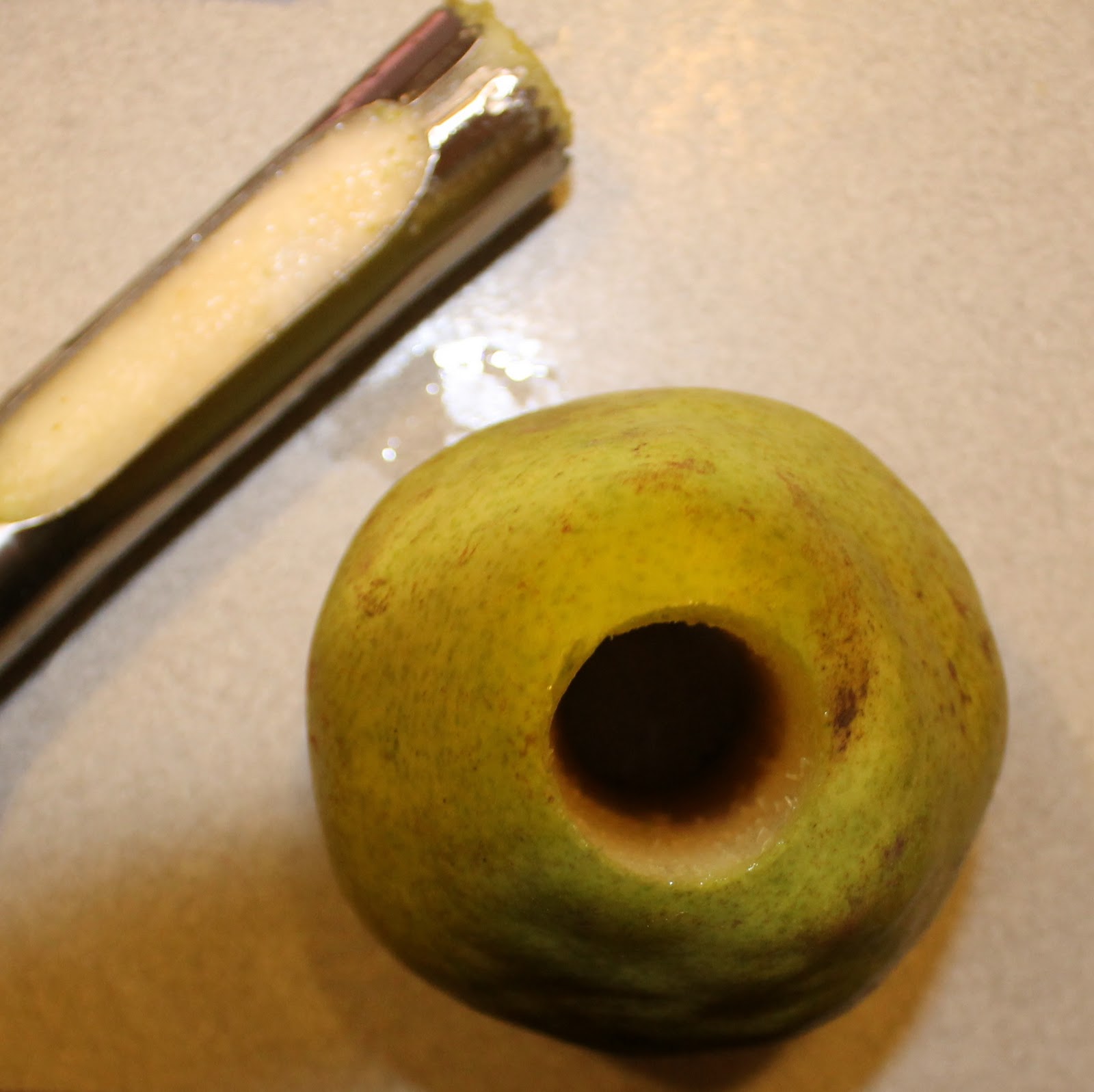 Use an apple corer to core your pear. This was surprisingly easy (I have no clue why I thought this would be a battle).