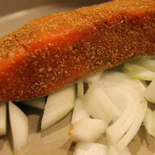 Add the salmon on top of the onions. Bake at 400 degrees for 20 minutes or until flaky.