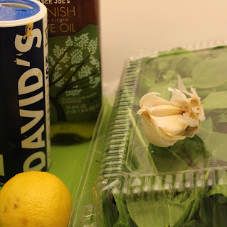 When there is about 5-10 minutes left on the salmon, prepare the spinach. Heat the olive oil over medium heat. Add the garlic and saute for 1 minute.