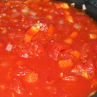 6. Remove the tomatoes from the can, reserving the liquid. Roughly chop the tomatoes. Add the tomatoes, liquid, and wine to the pan and bring to a boil.