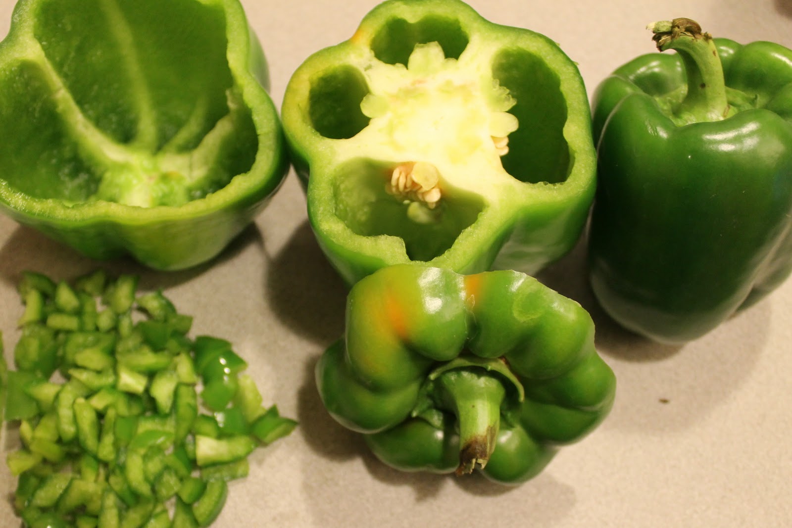 Cut off top of peppers, removing the seeds and membranes. Dice the edible parts of the tops of the peppers.