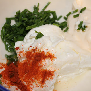 - Combine the Greek yogurt, mayo, chives, lemon juice, and paprika in a small bowl.