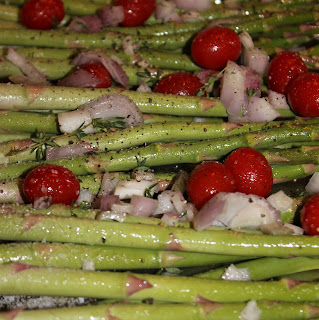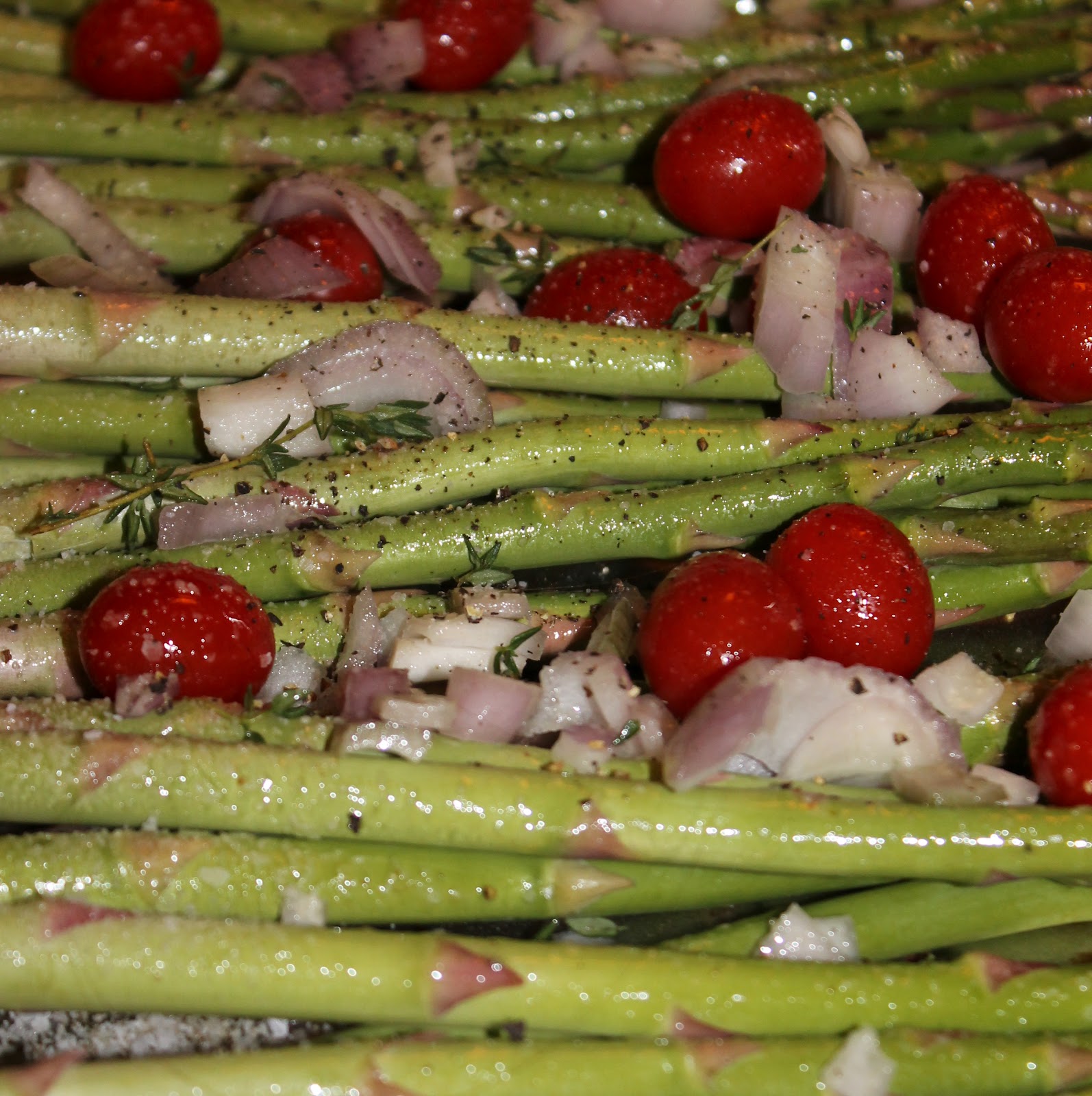 - Combine 1 pound trimmed asparagus, 1/2 cup grape tomatoes, 1/3 cup sliced shallots, and 1.5 teaspoons chopped fresh thyme on a cookie sheet. Season with salt and pepper. Coat lightly with cooking spray. Bake at 400 degrees for 6 minutes or until crisp.