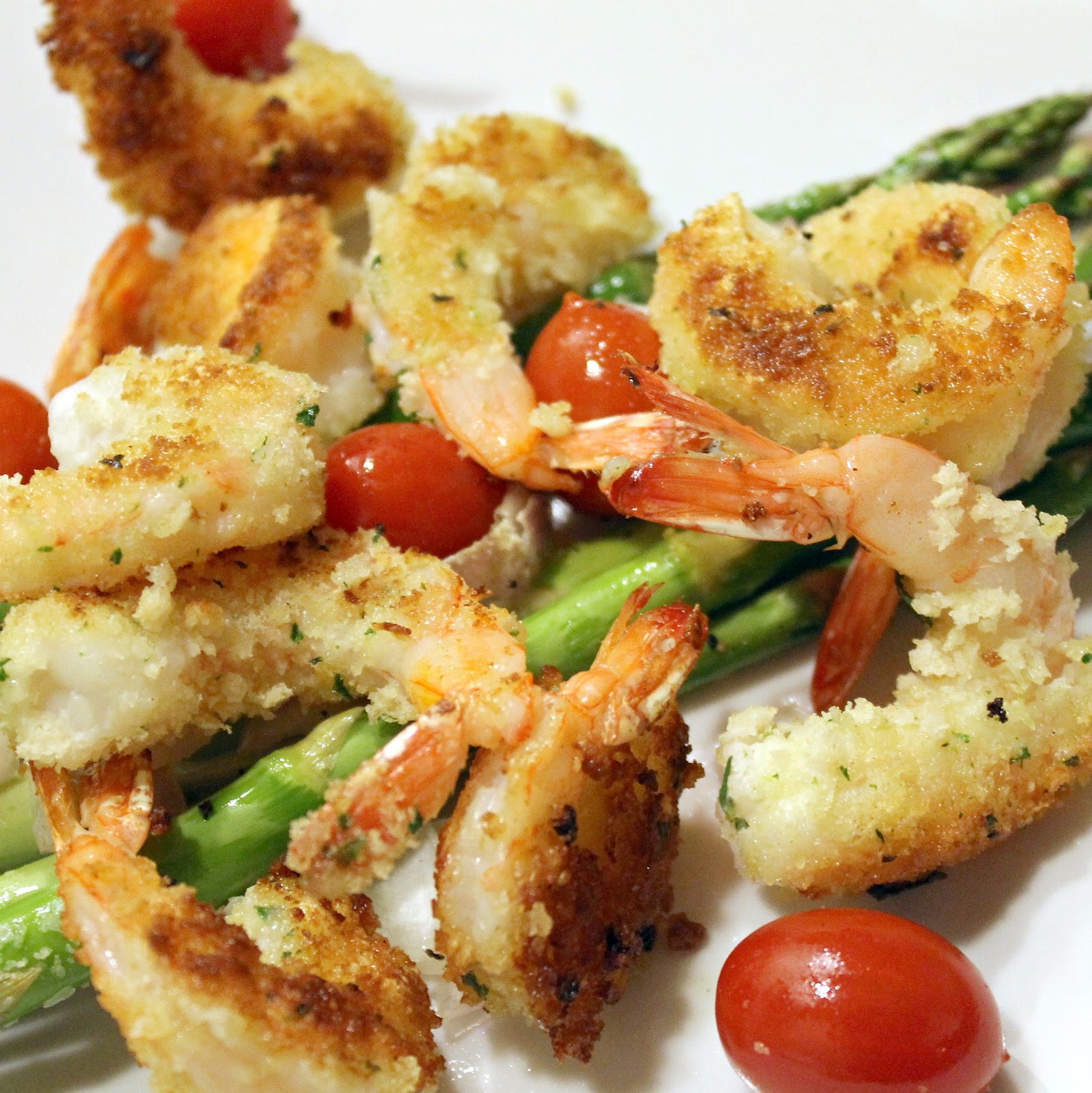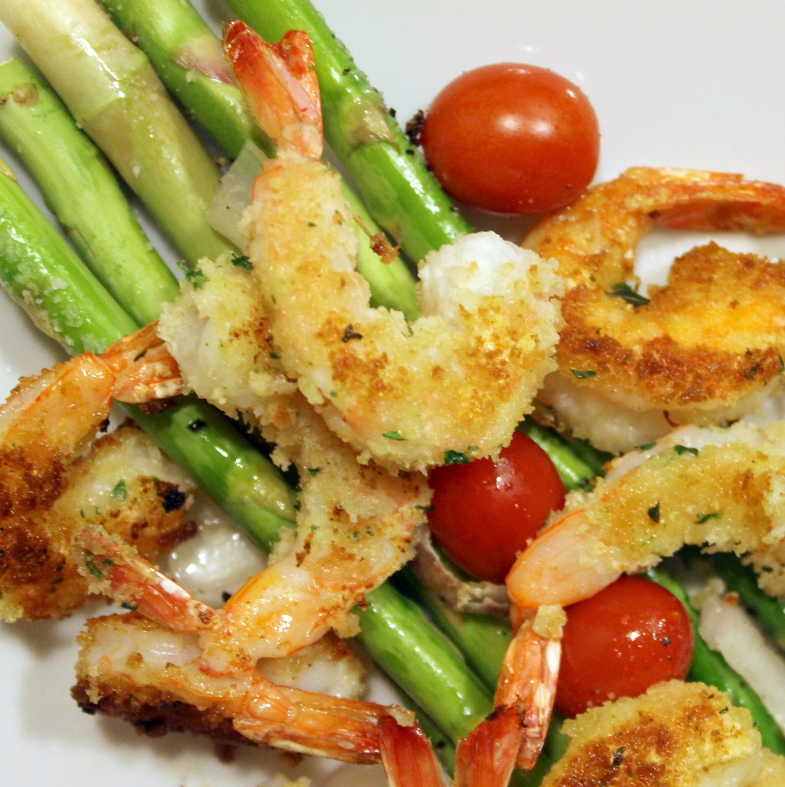 A 40-minute meal perfect for weeknights! Breaded herbed shrimp served with roasted asparagus and tomatoes