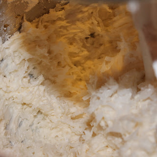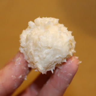 - Take the coconut mixture out of the refrigerator and get ready to get very sticky. Form the coconut mixture into tiny balls, slightly bigger than a melon baller.