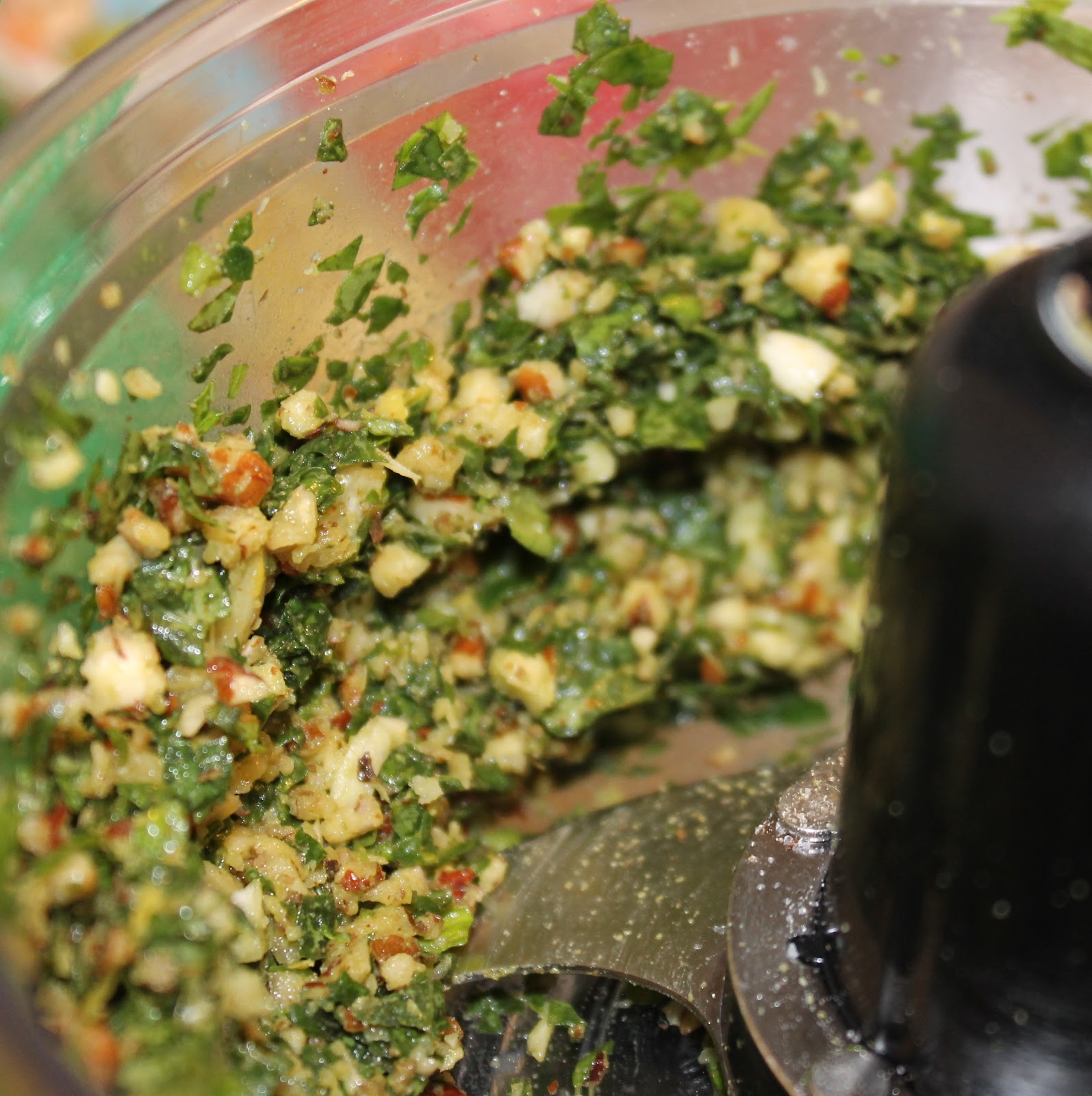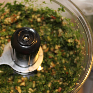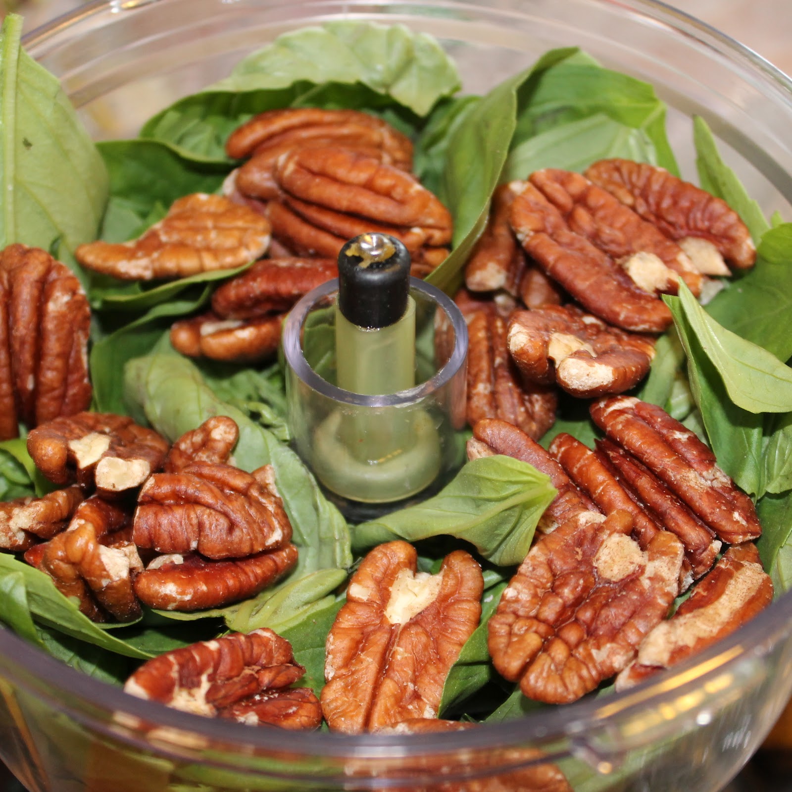 While waiting for the orzo to cook, prepare your pesto. Add the basil leaves and walnuts to a food processor and chop.
