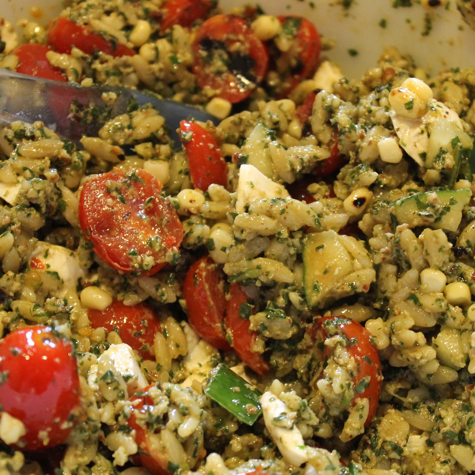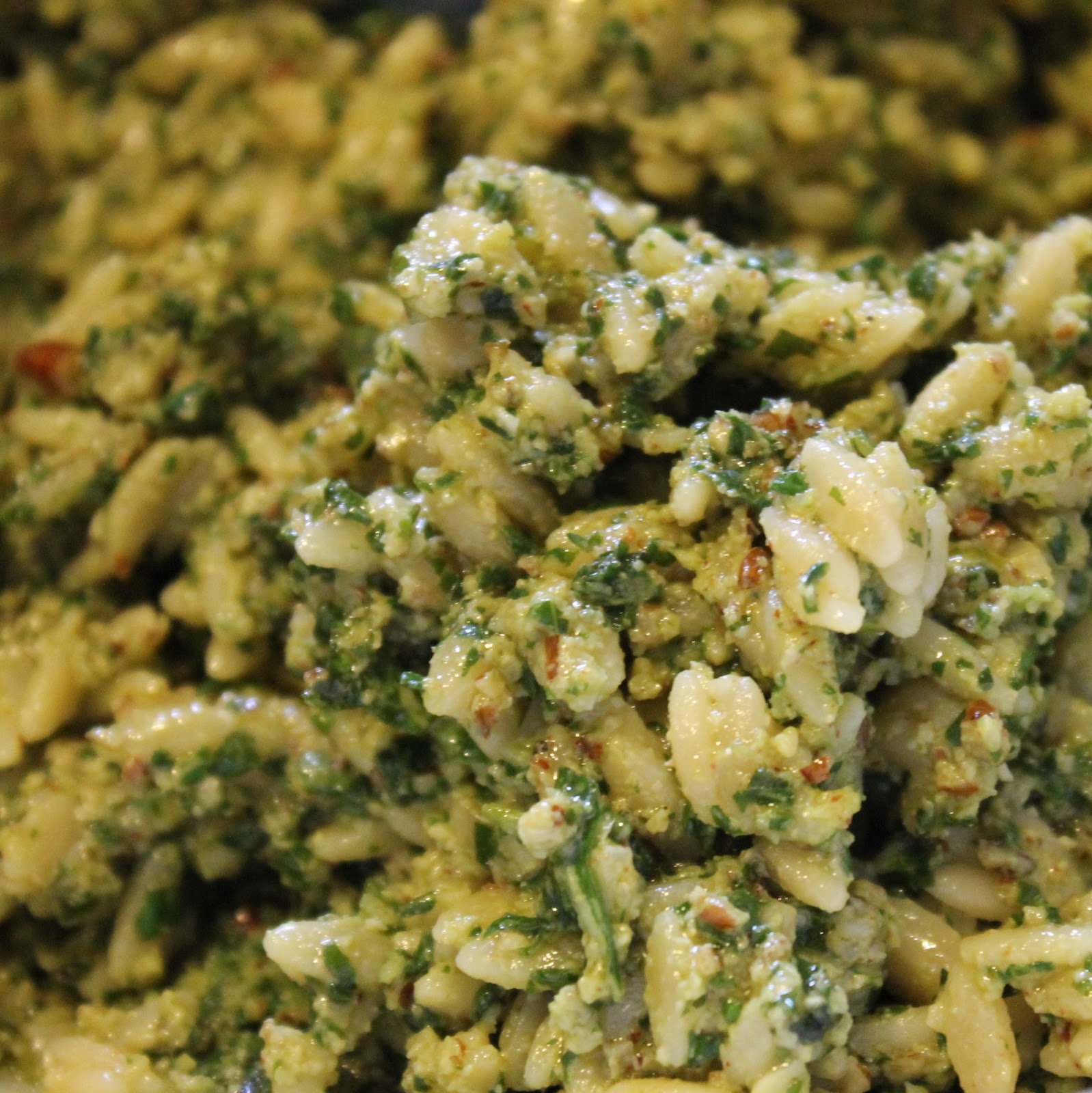 Add the pesto to the orzo while the orzo is still warm (it makes mixing easier). Set aside.