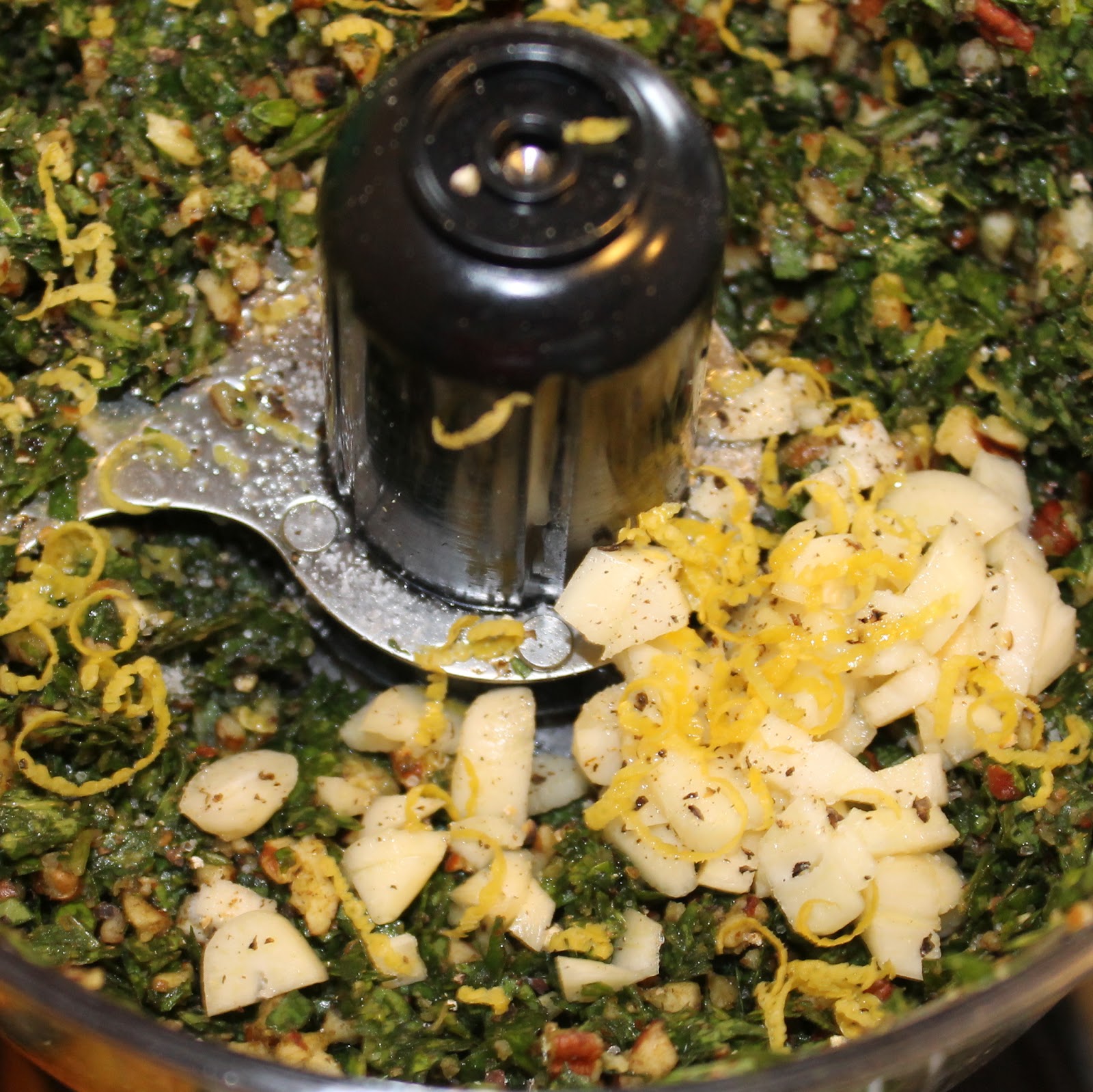 Add the minced garlic, lemon, zest, salt and pepper and pulse to combine.