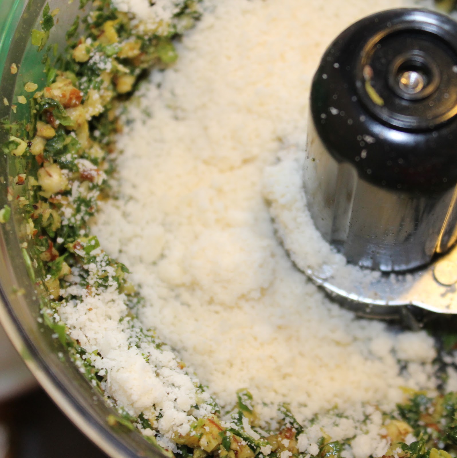 Add the cheese and process. While the food processor is running, add the olive oil in a steady stream. Process until combined.