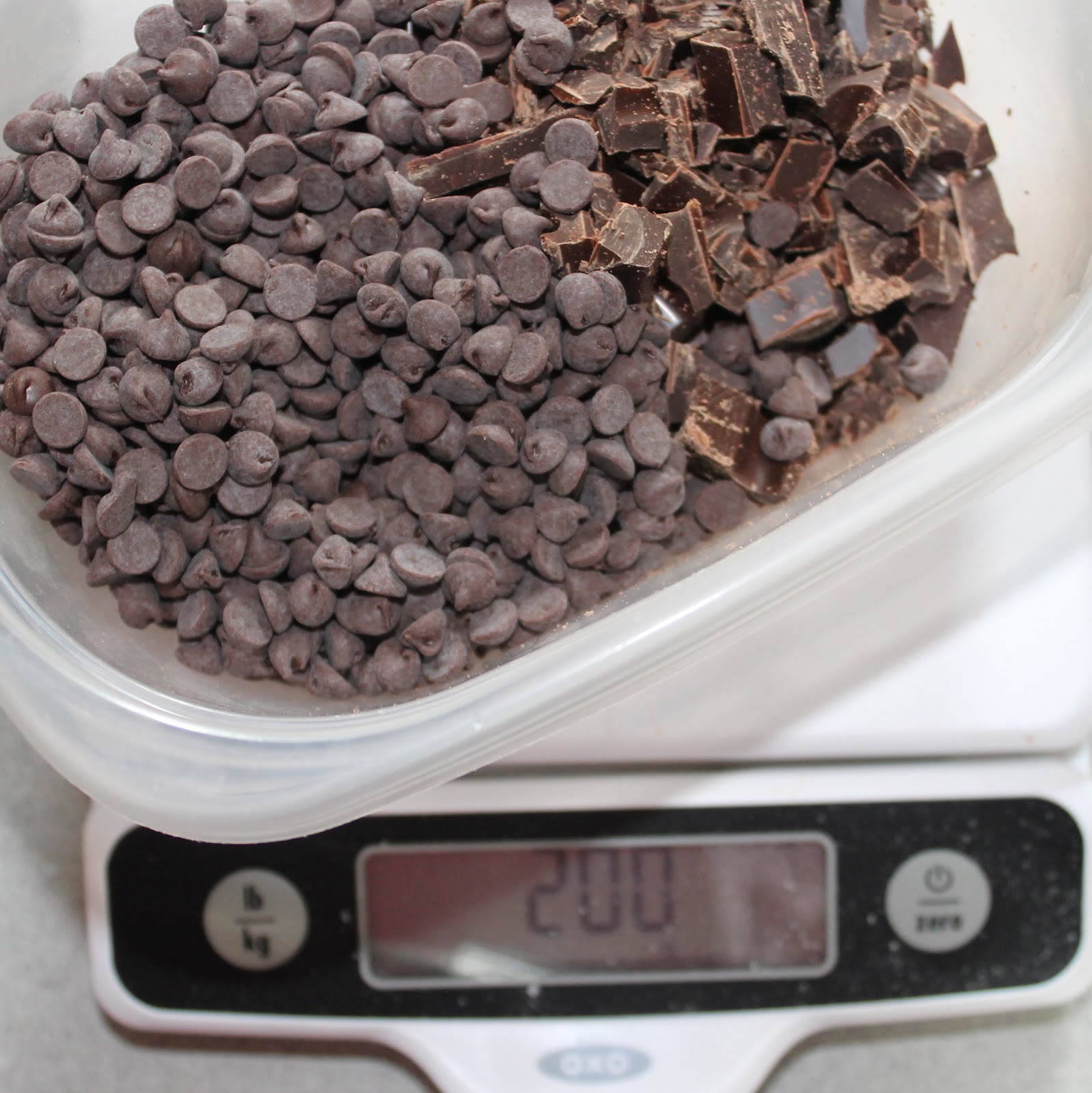 To pass the time, I prepared my ingredients. If you have a food scale, baking is the best time to make use of it. When possible, I try to use the weights given for flour and the like. I also weighed out my chocolate because I didn’t have nearly as much dark chocolate as I thought I did! So I had to use some semi sweet chocolate chips to get enough for the recipe. I also combined my sugars together while waiting for the butter to soften.