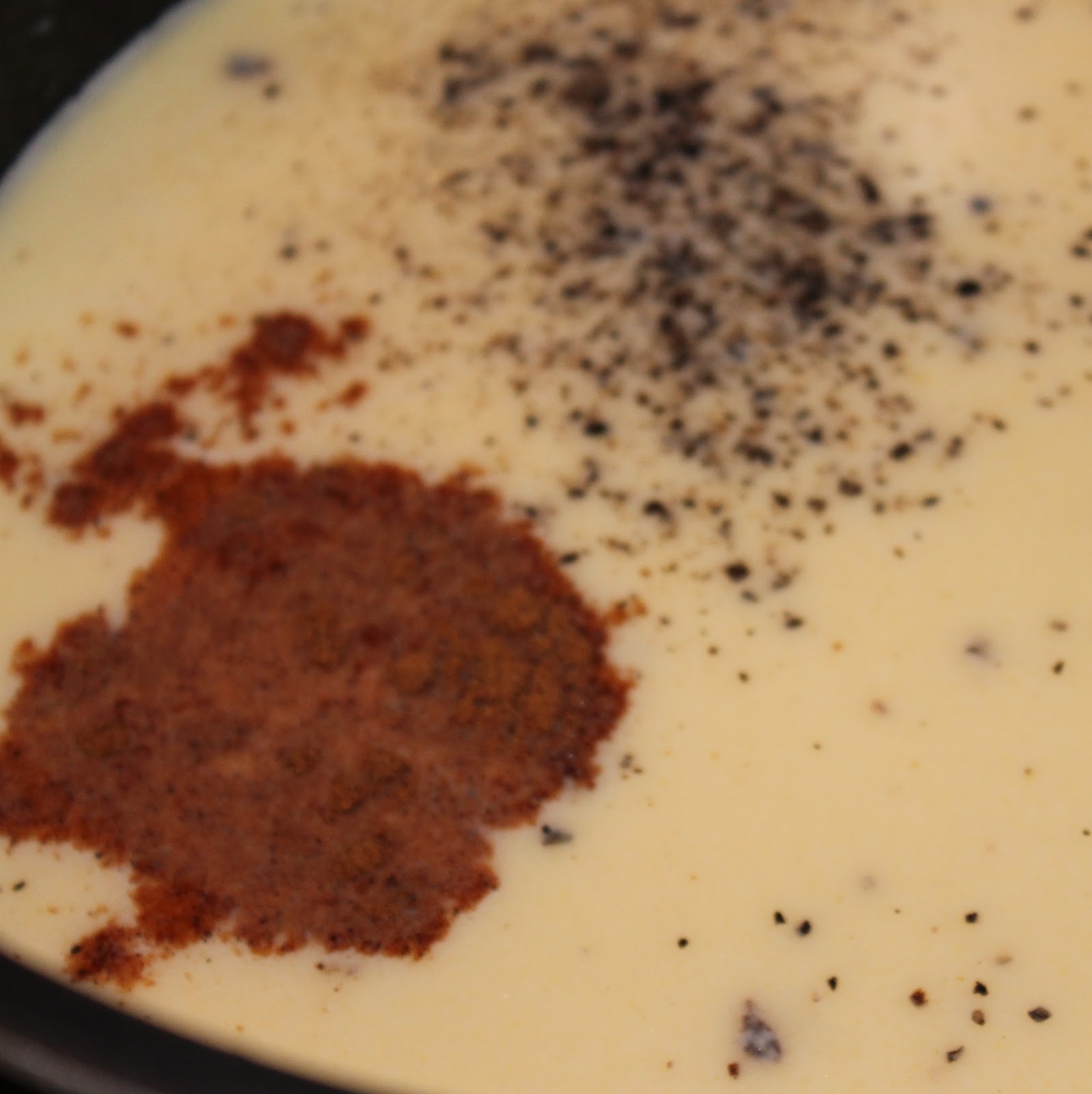 - Add the grated cheeses (Comte and Tomme de Berger), 1 teaspoon salt, ½ teaspoon pepper, and ½ teaspoon nutmeg.