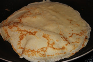When ready to make the crepes, heat your saute pan over medium heat. Melt some butter in a small pan (maybe 1 teaspoon), and use the melted butter to brush the saute pan. Add 2-3 tablespoons of batter to the center of the pan. (I used a bigger pan and ended up using 4-5 tablespoons).