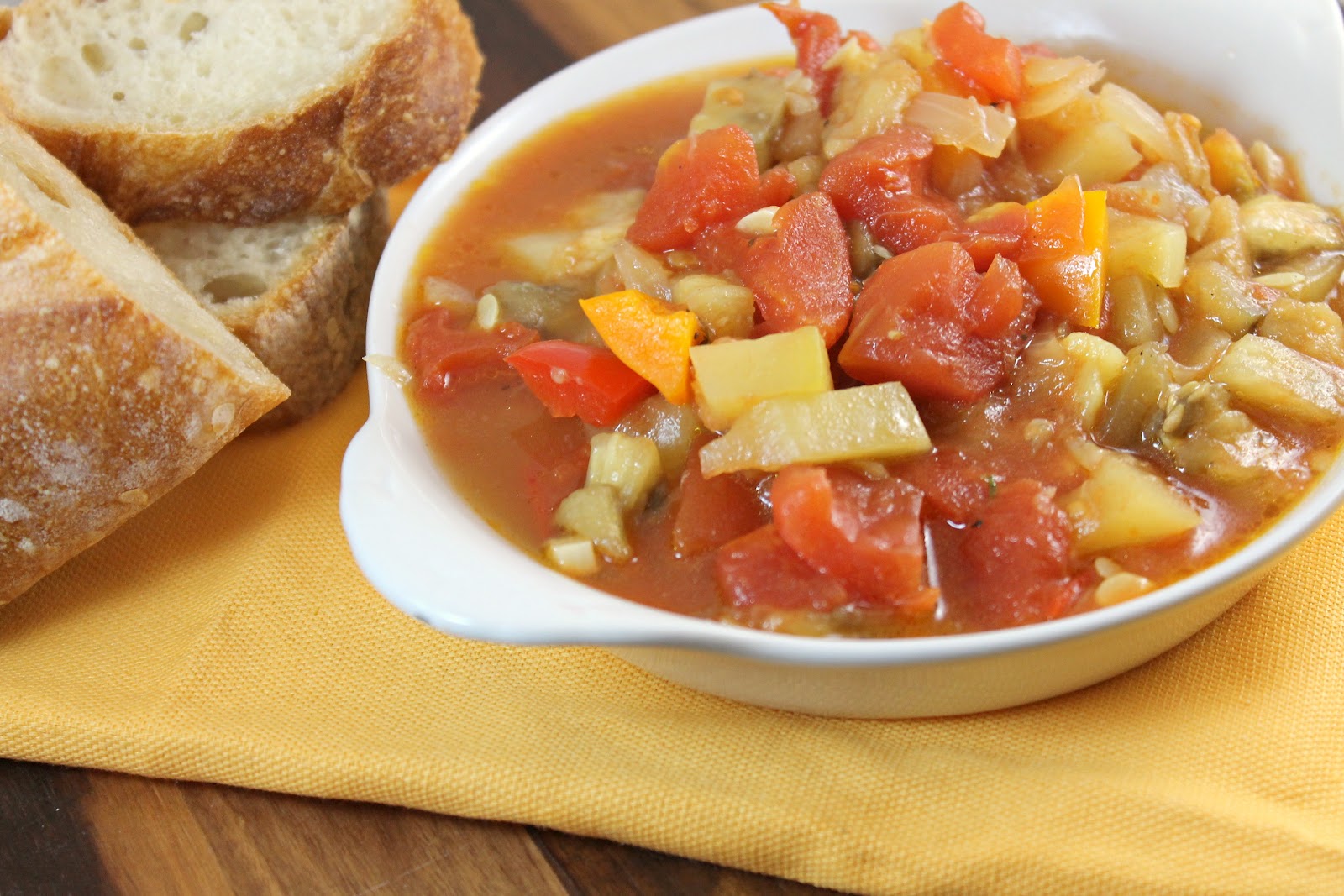 So what is ratatouille, besides a really cute kids movie? It’s basically a stewed vegetable dish, usually served with bread, or maybe egg noodles or polenta (something to sop up all the deliciousness). There are many different recipes for the dish, but most include eggplant, zucchini, peppers, and onions. The spices can range from thyme or marjoram to herbes de Provence.