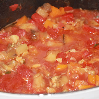 Add the garlic and cook for another minute. Stir in the eggplant and zucchini and season with salt and pepper. Add 3/4 cup of water, cover, and simmer for about 5 minutes, stirring once half way through. While waiting for the 5 minutes to pass, chop your peppers.