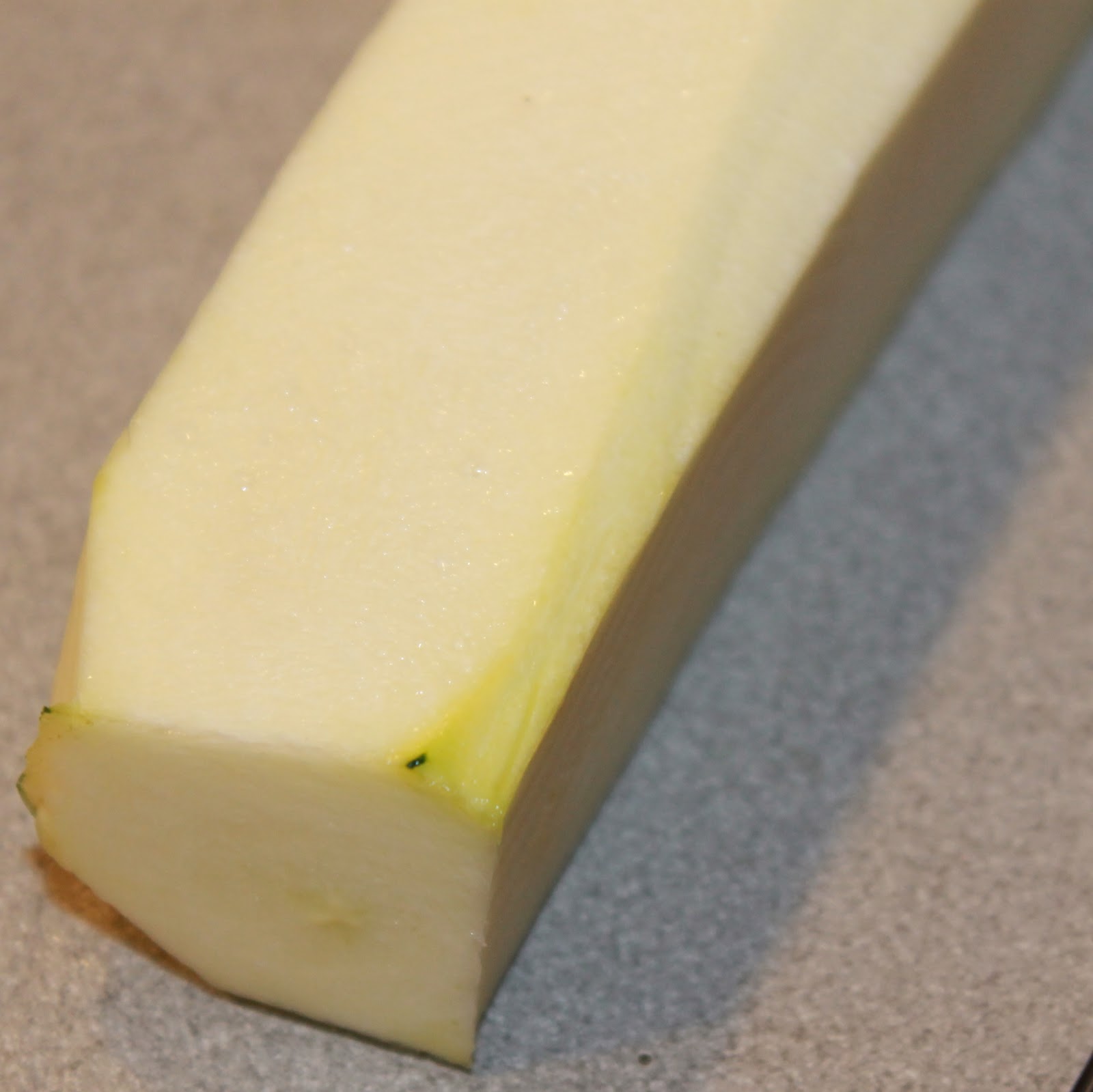 To cut the zucchini, remove the skin using a knife by cutting the zucchini into a square shape (or close to a square.)