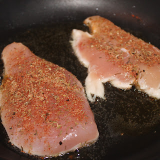 Heat a saute pan over medium heat and add the coconut oil. Sprinkle the seasoning on both sides of the chicken pieces and add to the pan.