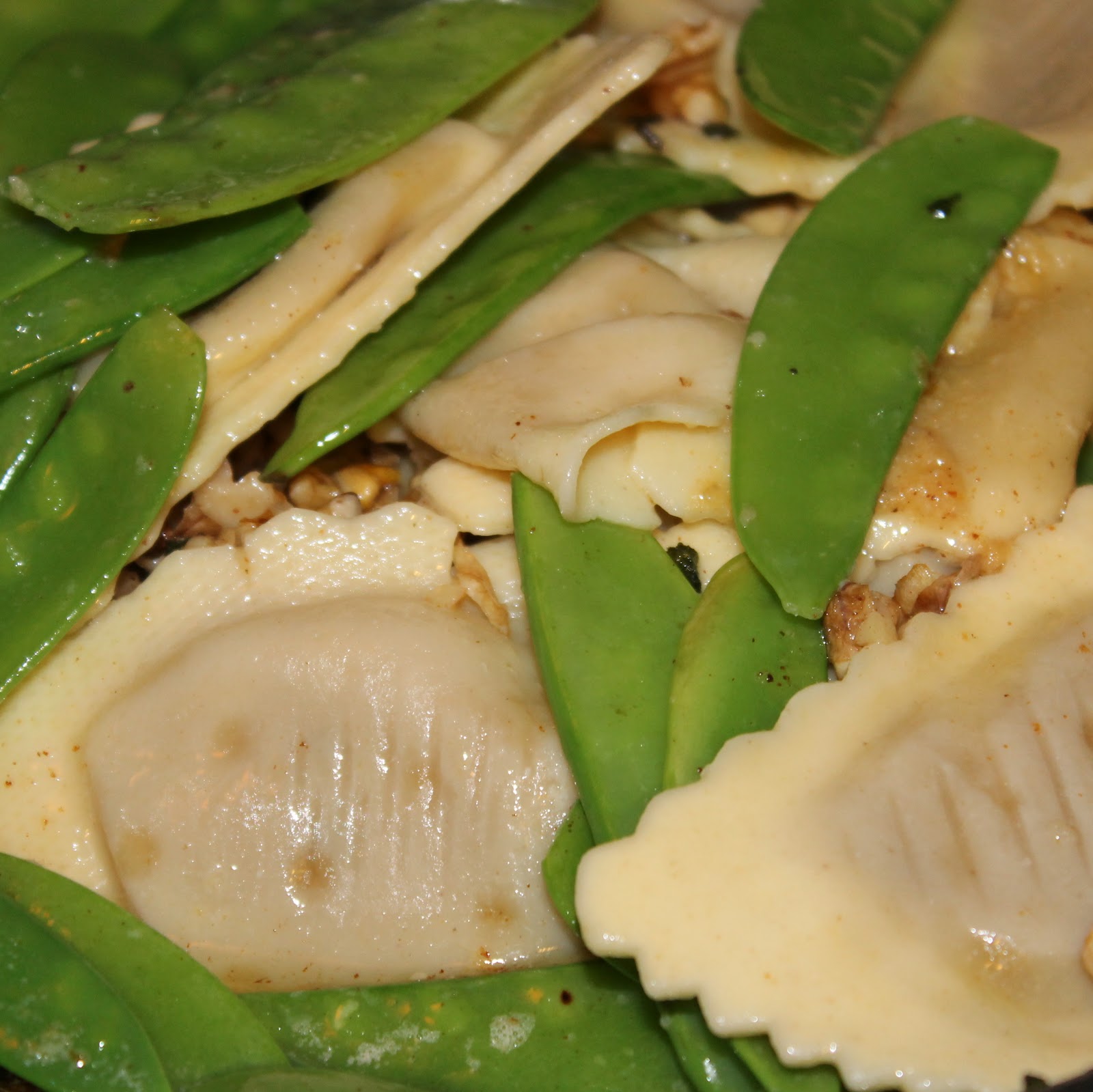 Add the agnolotti and the snow peas to the butter mixture and toss to coat.