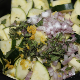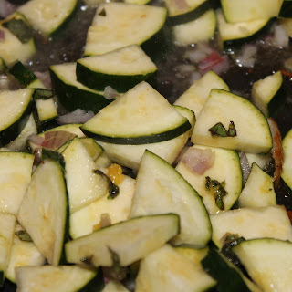 To make, bring a pot of water to a boil. While waiting for the water to boil, dice the zucchini, mince the shallots, chop the oregano, and grate the lemon rind. I just added all of these to a bowl so I could throw them all into the pan at the same time.