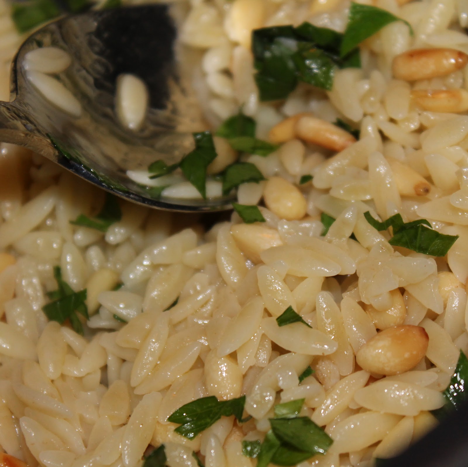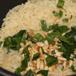 Remove from heat and keep warm (I put mine in a tin foil tent). By now the orzo is probably cooked. Drain and add to a bowl. Stir in the parsley, pine nuts, and olive oil. Season with salt, to taste.