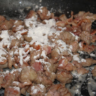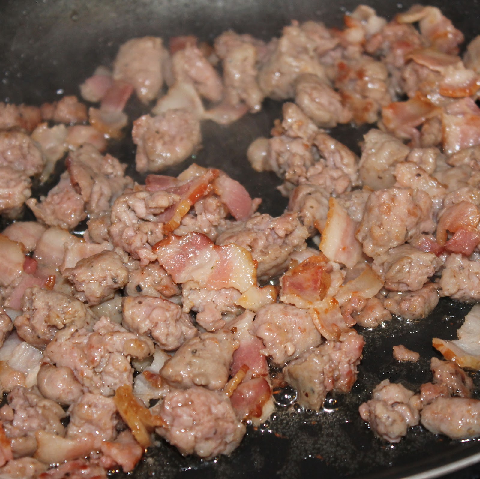Cook the sausage and the bacon until browned, about 7 minutes, over medium high heat.