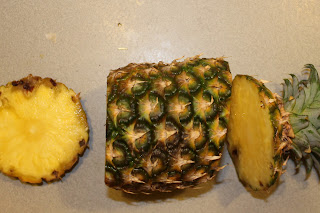 1. To cut a whole pineapple: Start by cutting off each end of the pineapple. Next cut off the skin of the pineapple. Slice the pineapple into one inch slices. To core the slices, you can use a pairing knife to cut out the center.