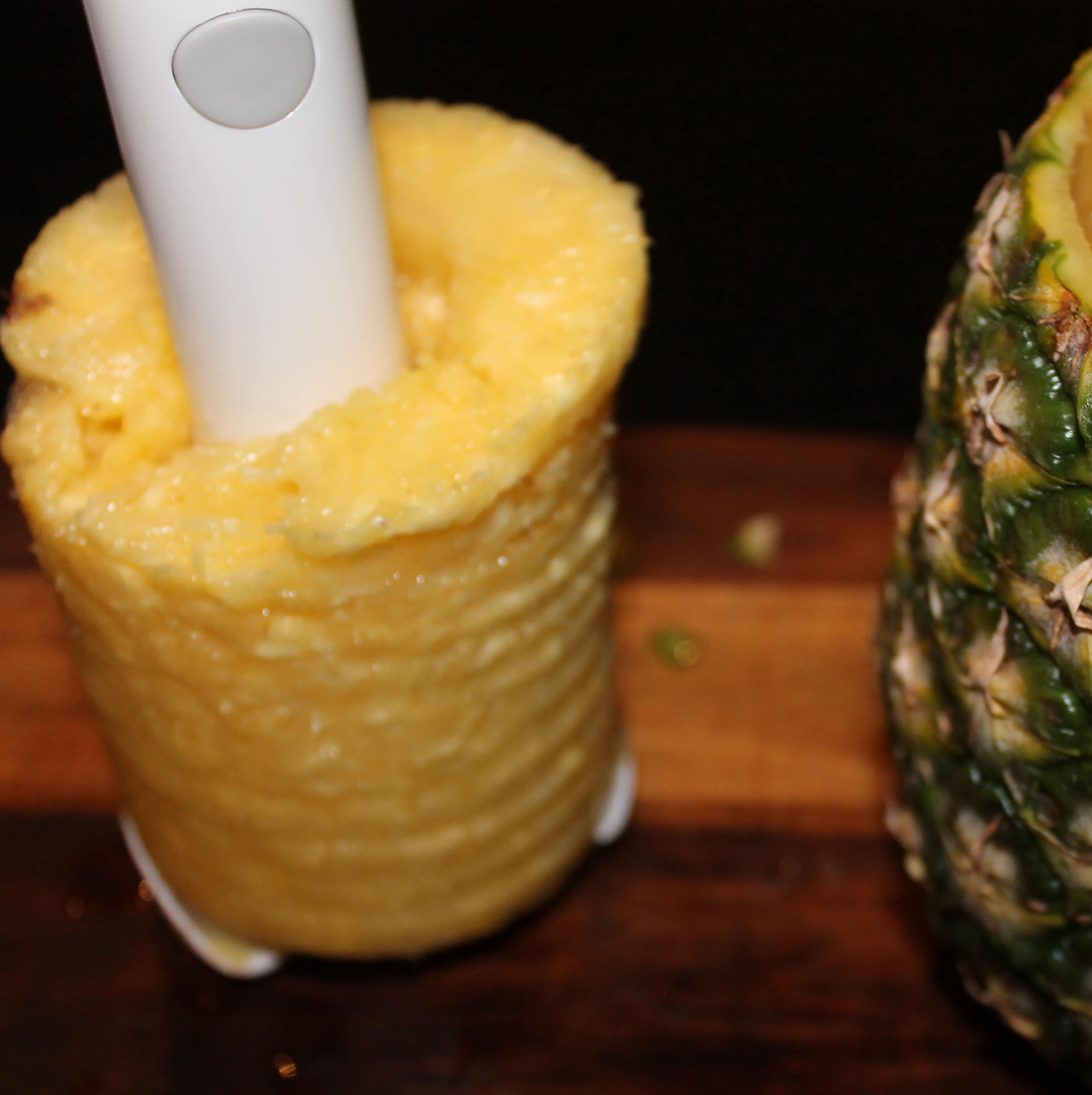 OXO recently sent me the PERFECT tool for this recipe: a racheting pineapple slicer. I’m kind of obsessed with this tool. Not only does it core and slice the pineapple, but it also keeps the outside of the pineapple completely in tact! You could throw a fruit salad in there, or hey, make yourself a pina colada! How snazzy!