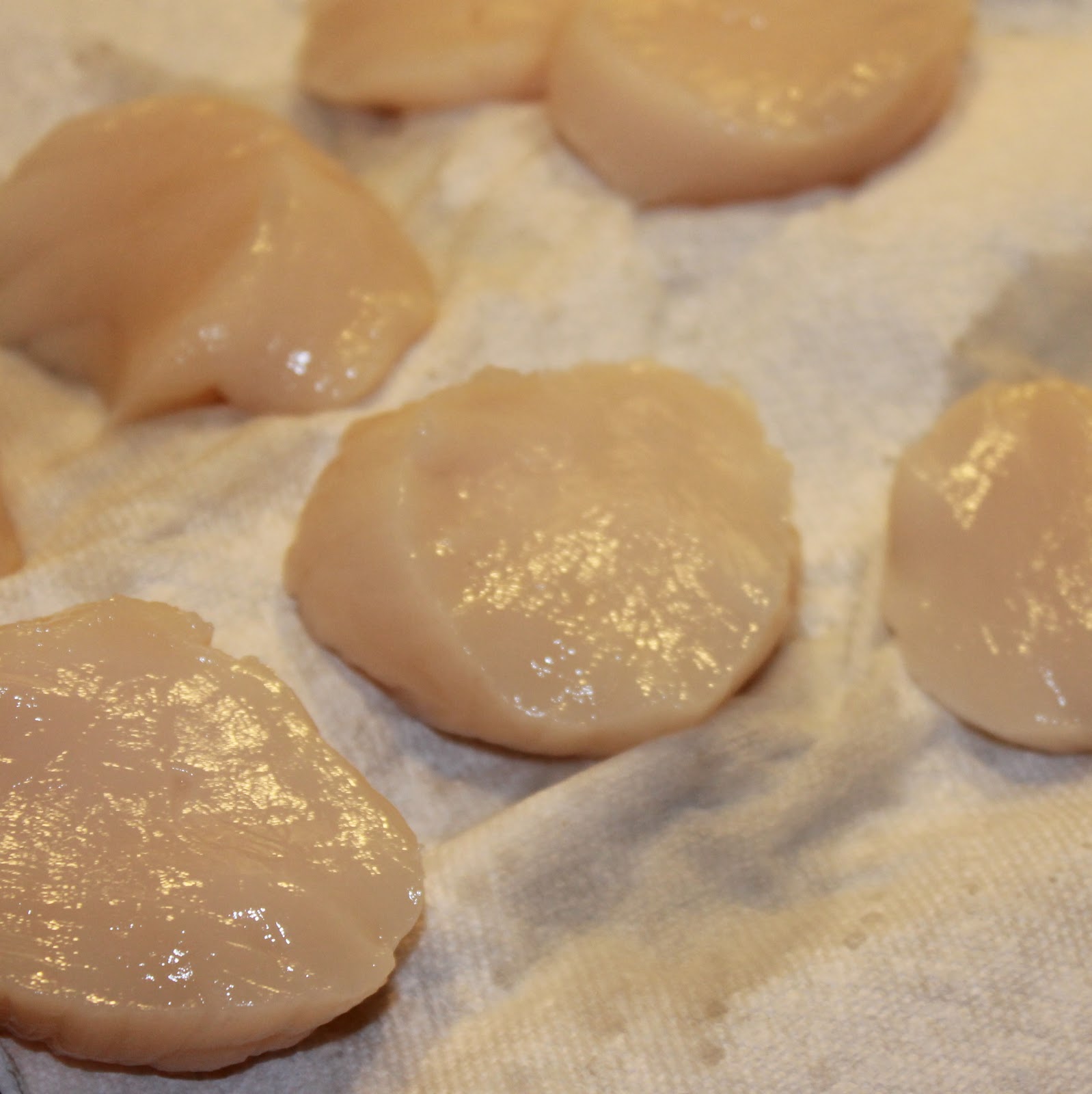 - Dry the scallops on a paper towel and cut in half (about 1/4 inch thickness).