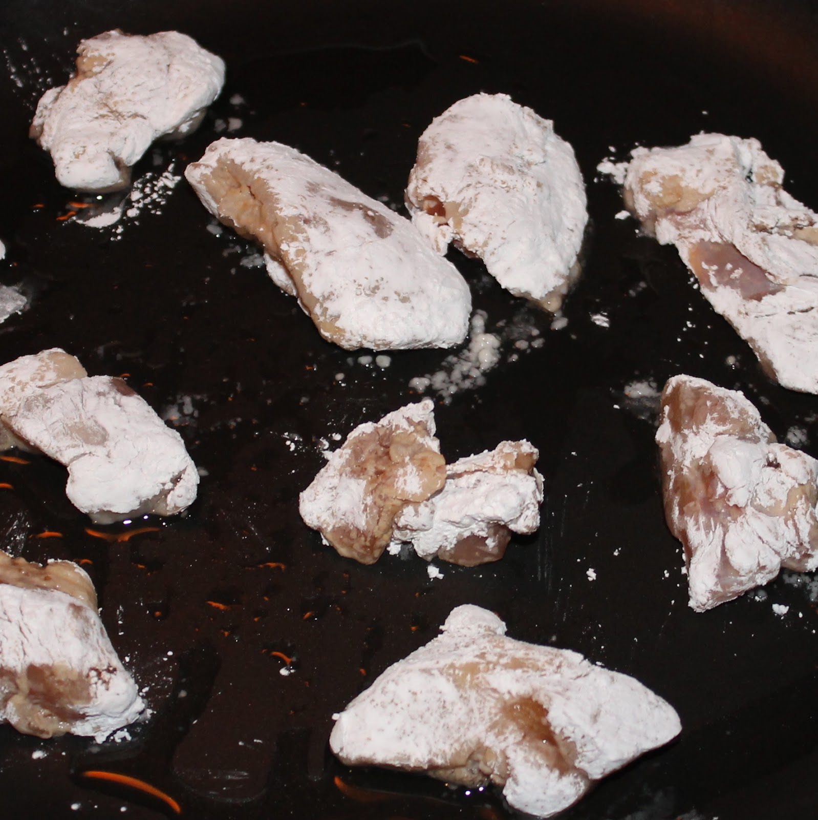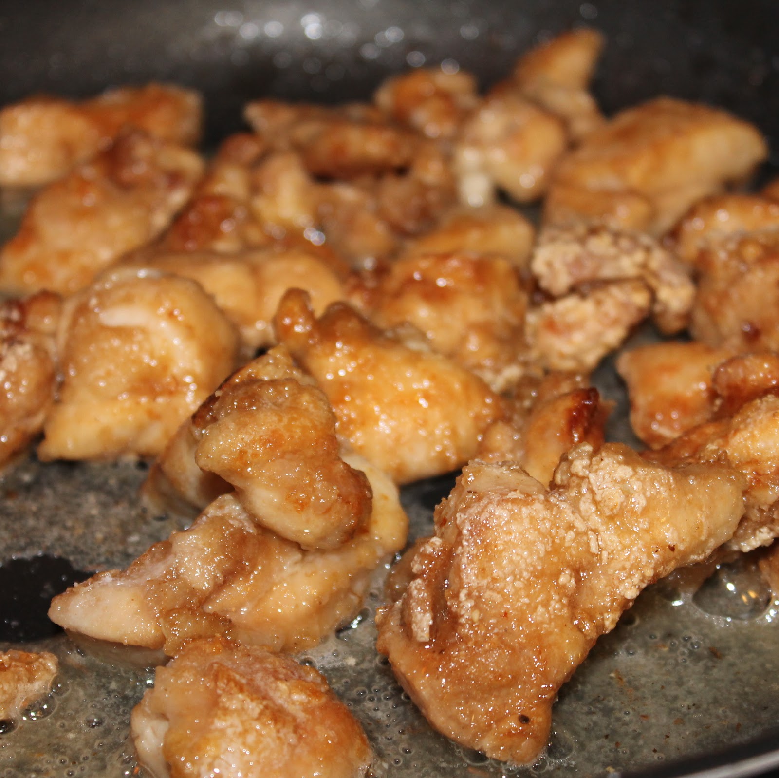 - Remove the chicken from the bag and discard the marinade. Add 1/4 cup cornstarch to a dish. Add the chicken to the cornstarch and toss to coat. Shake off excess cornstarch. Heat a large saute pan over medium high heat and add 1 tablespoon canola oil to the pan. Add half of the chicken to the pan and saute for 6 minutes, turning to brown.