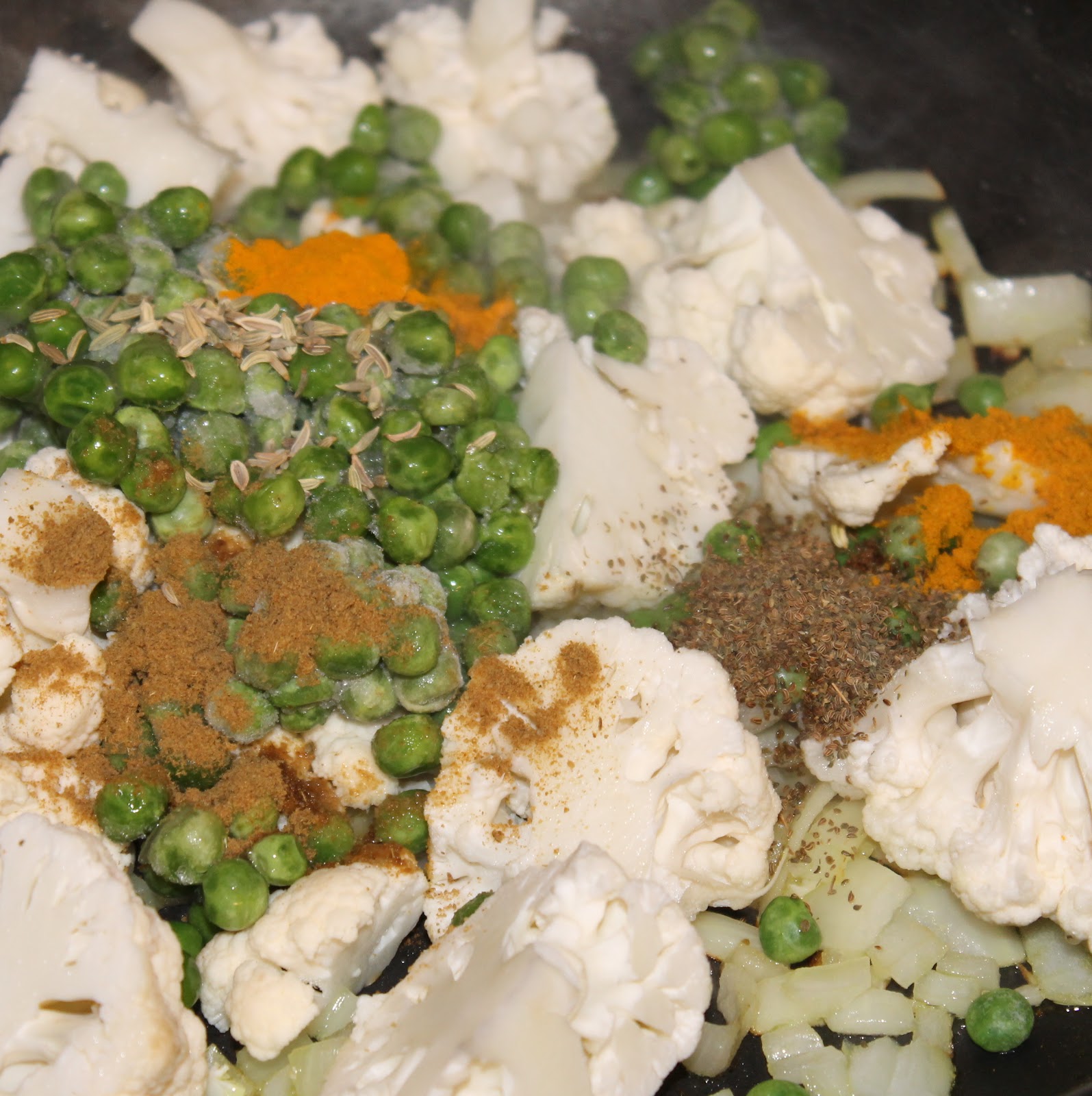- Add the peas, cauliflower, cumin, celery seed, fennel seed, tumeric, and the remaining 4 teaspoons curry powder.