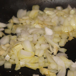 Using the same saute pan, add 2 tablespoons of olive oil over medium heat. Add the yellow onion and garlic. Cook, stirring, for 1 minute.