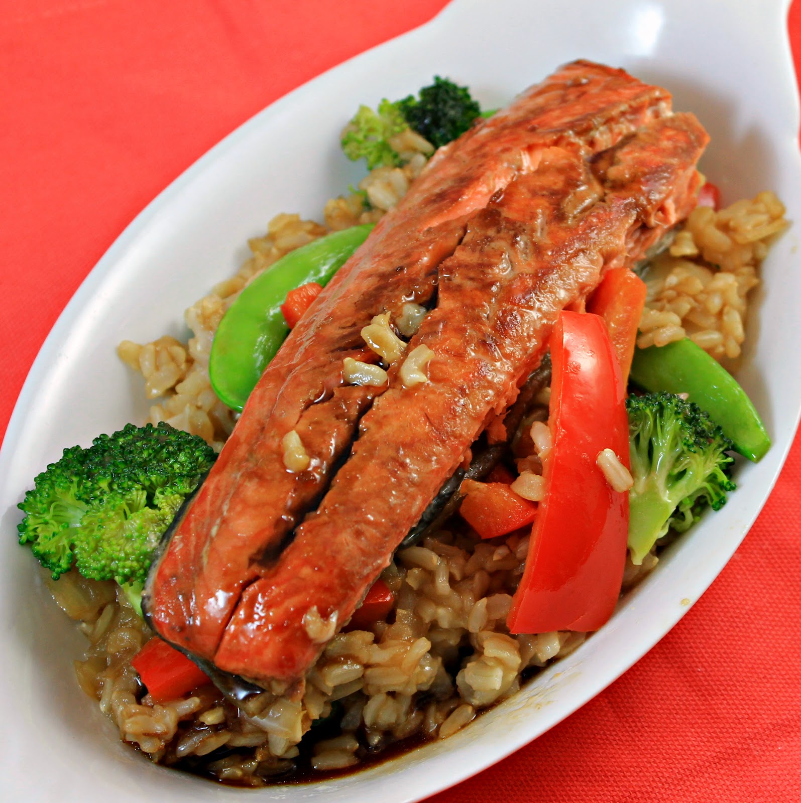 I decided to make a stir fry teriyaki dish using my favorite protein, salmon. Normally stir fry is a quick dinner choice but brown rice takes quite a bit of time to cook. But it gives you plenty of time to prep your veggies and hang out with your dinner guests!