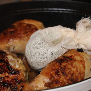 Return chicken to pan. Add shallots and stock; bring to a boil. Place peppercorns, thyme, bay leaf, and parsley on a double layer of cheesecloth.