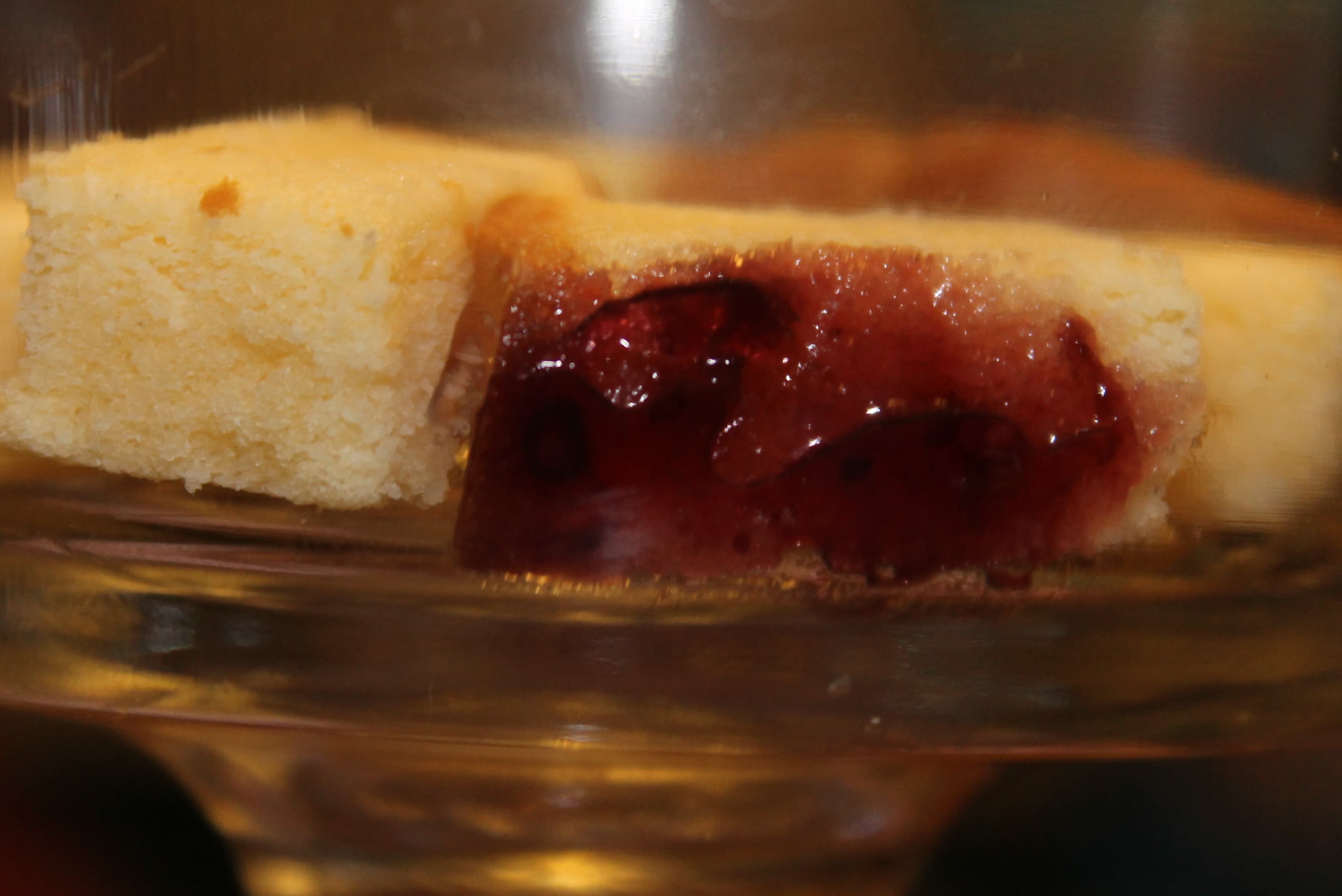 Alternate the jam slices and the liquor slices in the bottom of your bowl. (to get the effect of the layering, use a clear glass bowl). Be sure to really press the cake against the sides of the bowl so that you can see the jelly. Be sure to also add some of the cake to the center of the bowl to create a complete bottom layer.