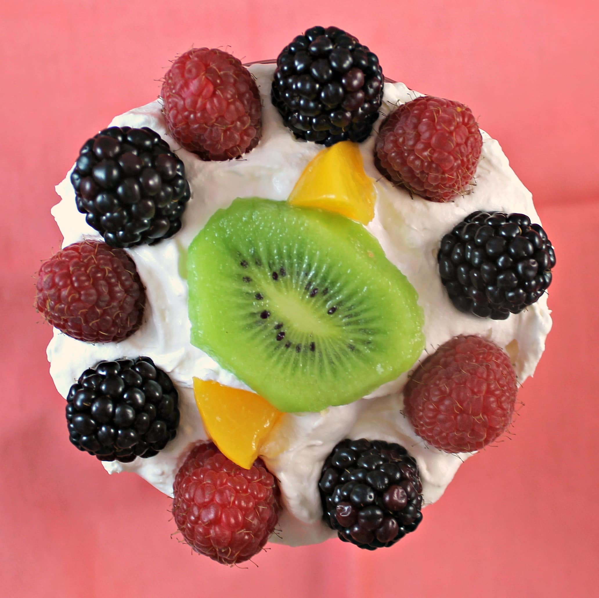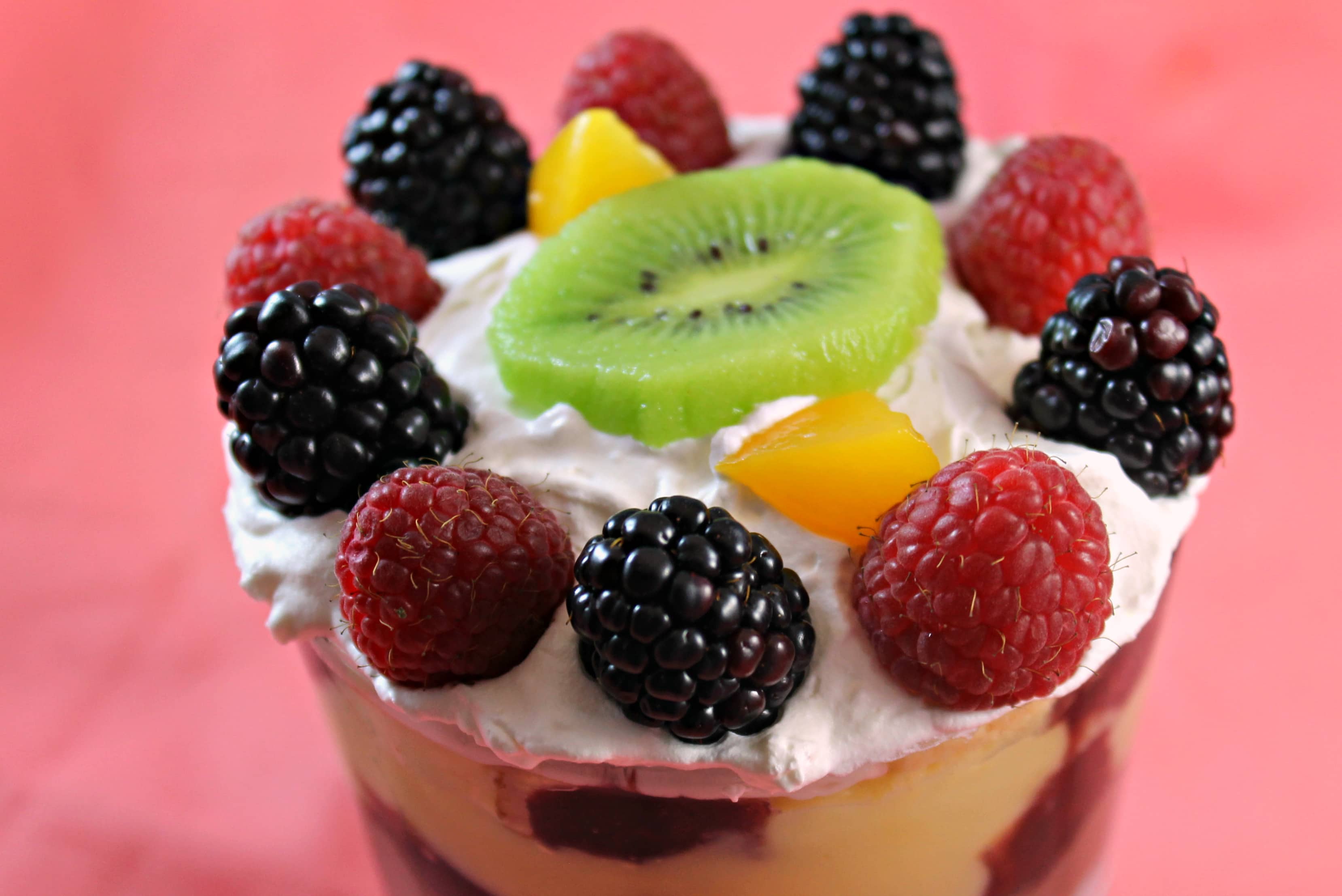 If you are making the trifle ahead of time, you can cover the trifle at this stage and refrigerate. When ready to serve, top with whipped topping. Add a kiwi slice to the center of the bowl on top of the whipped cream. Add slices of peaches around the kiwi to create a floral pattern. (On my mini trifle, there was not enough room for this, so I added a few cut pieces of the peach around the kiwi). Line the rim of the bowl with the berries, alternating between raspberries and blackberries.