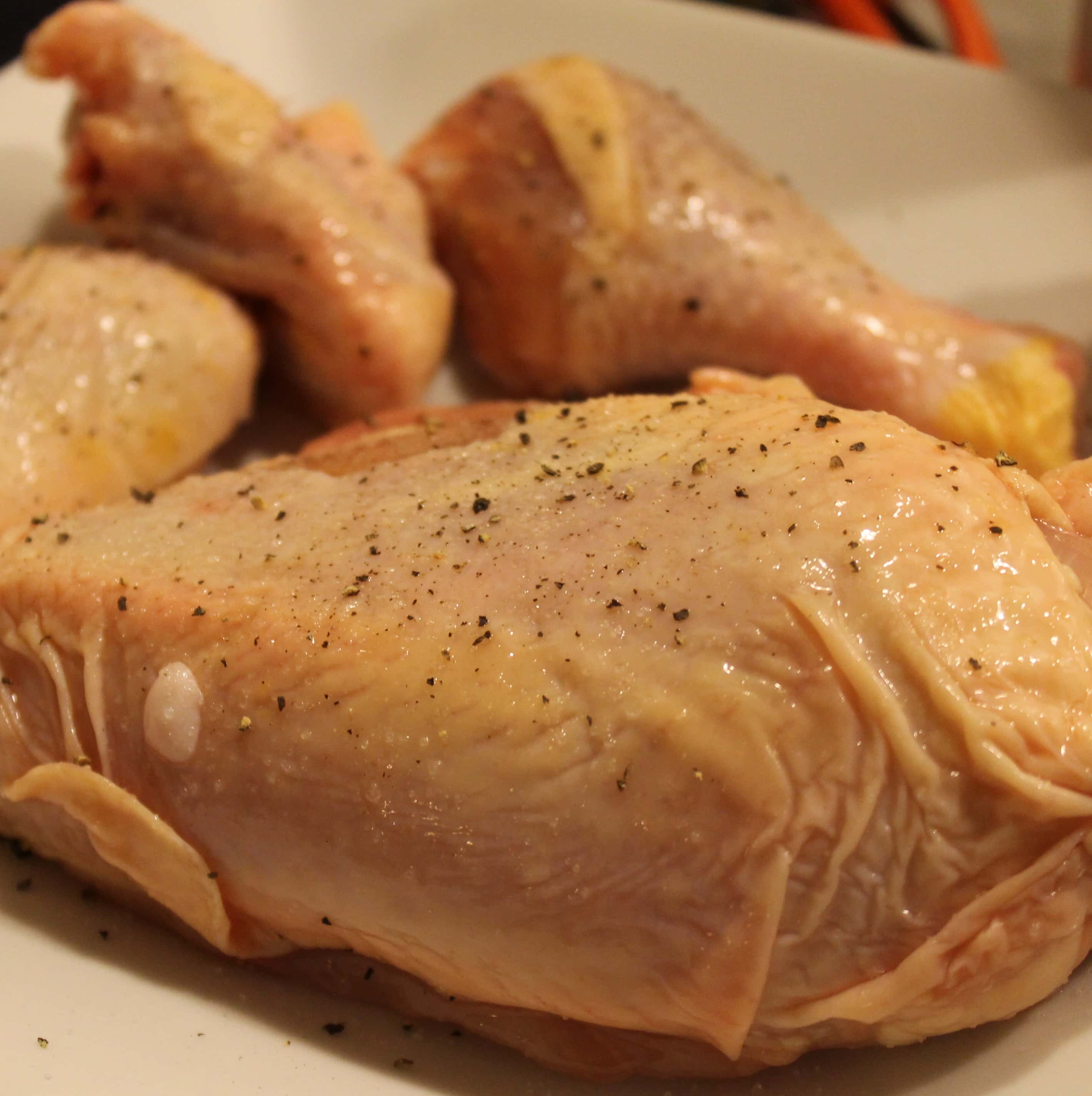 - 2 1/2 pounds chicken pieces (breast halves, thighs, and drumsticks) – bone-in, skin removed (I used 1 chicken breast, 1 thigh, 1 leg, and 1 drumstick)