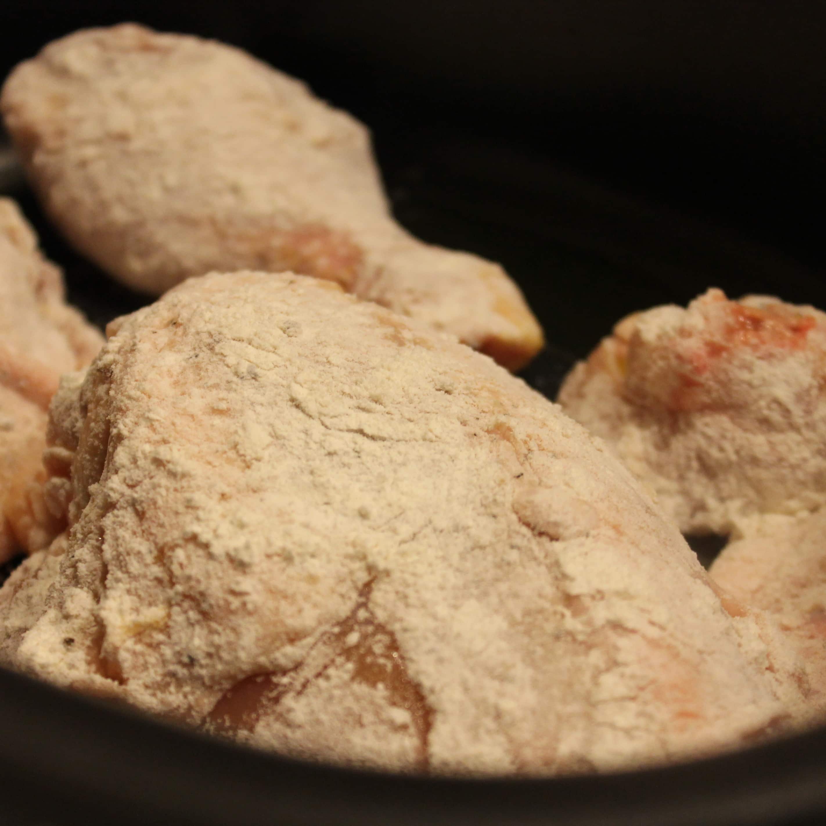 - Dredge in flour, shaking off the excess.