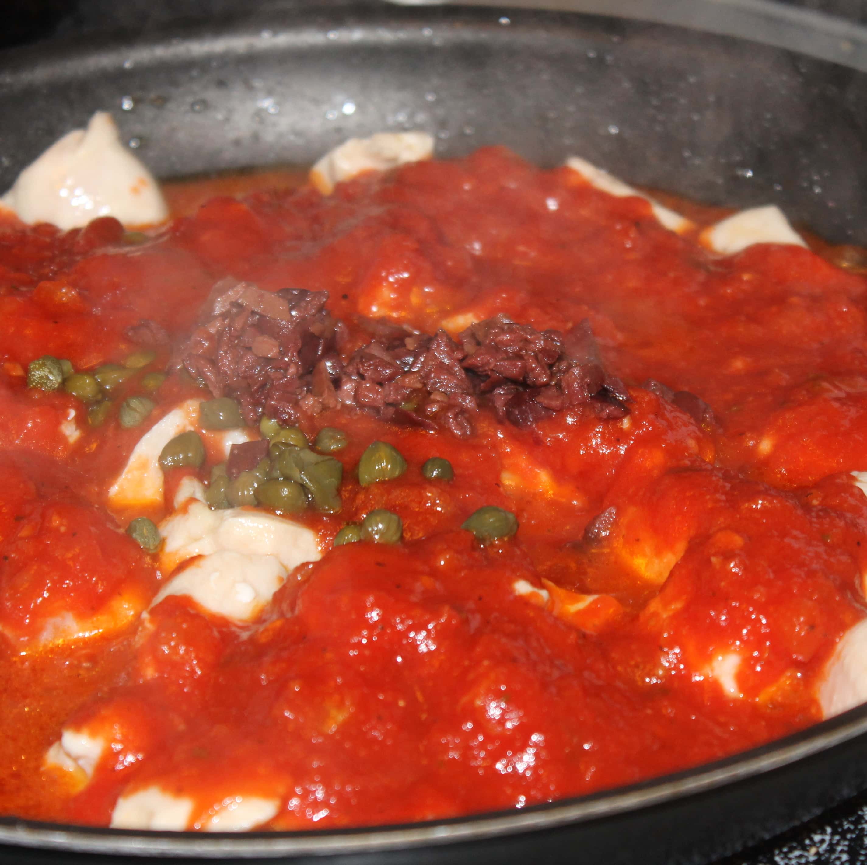 - Stir in pasta sauce, olives, capers, and pepper; bring to a simmer.